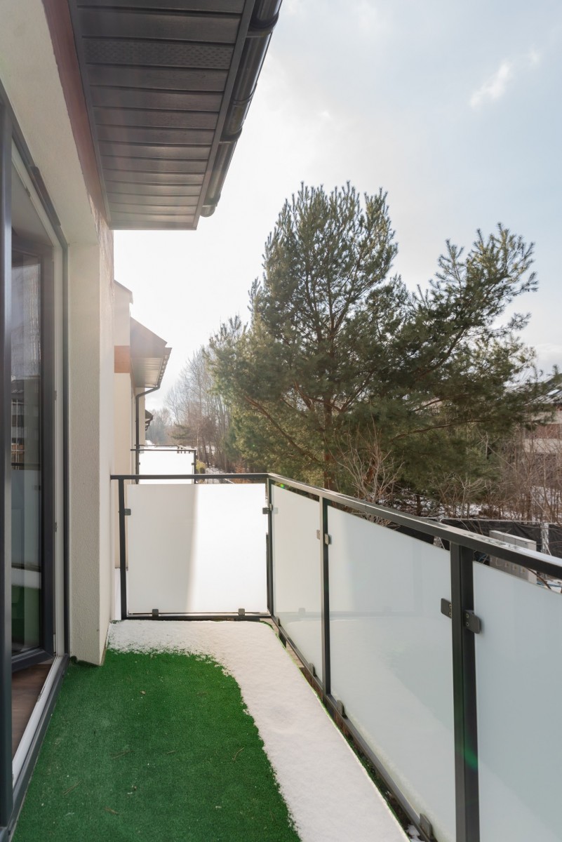 - Piętro: dwie sypialnie (9,90 m2 i 12,31 m2), pokój (8,67 m2) połączony z kuchnią (4,69 m2), balkon (3,80 m2) , łazienka (4,42 m2)