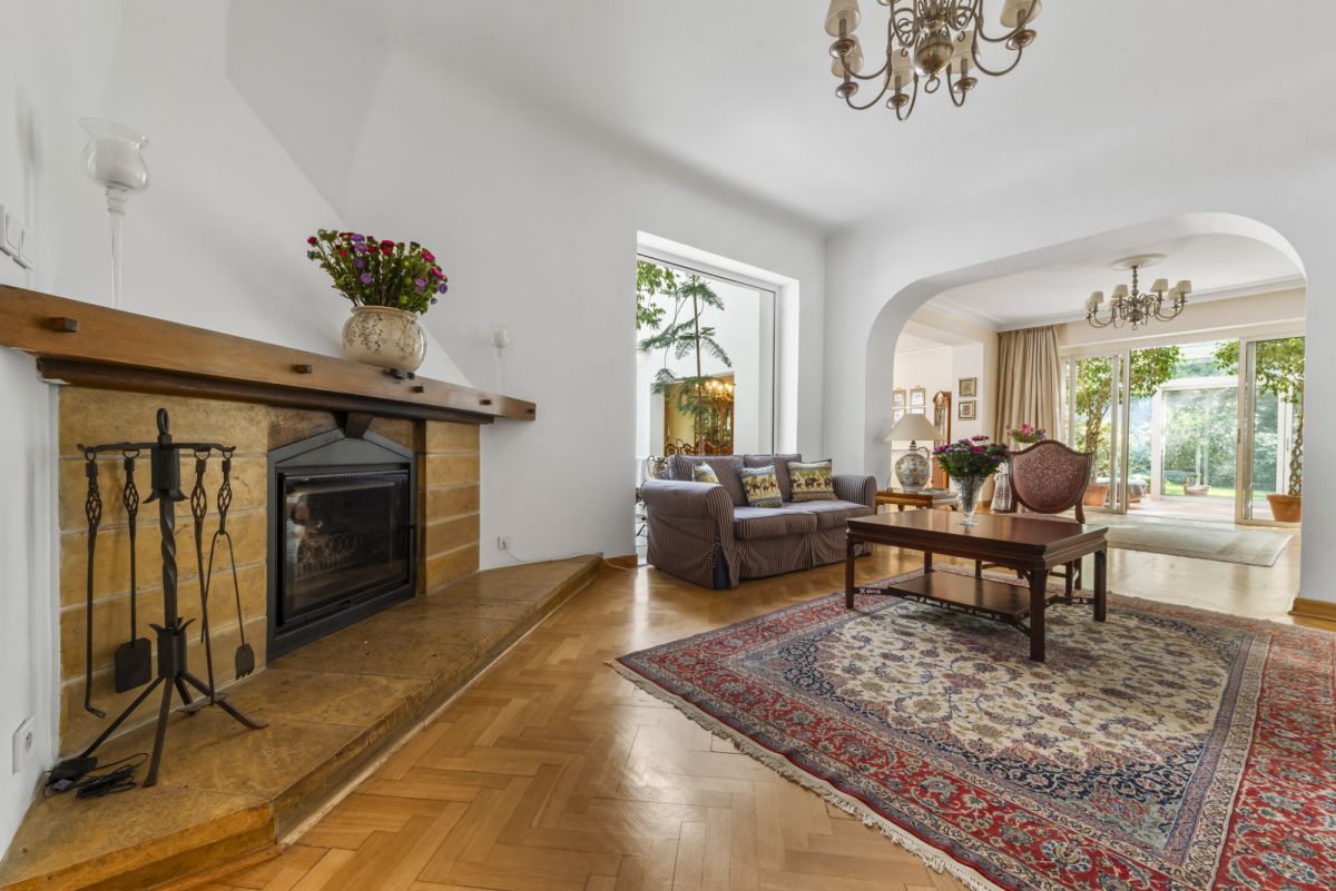 Spacious, representative living room with a fireplace, connected to the dining area and winter garden - together over 72 m²