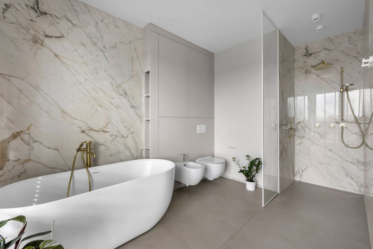 The first floor serves as a private living area. The master bedroom is designed to a high standard, featuring its own walk-in wardrobe and an en-suite bathroom equipped with a bathtub, shower, and double sink. Additionally, there are two more rooms (ideal as bedrooms, a home office, or a guest room), a second bathroom, and a separate wardrobe. The floor also includes two balconies, accessible directly from the rooms. A practical attic provides additional storage space.
