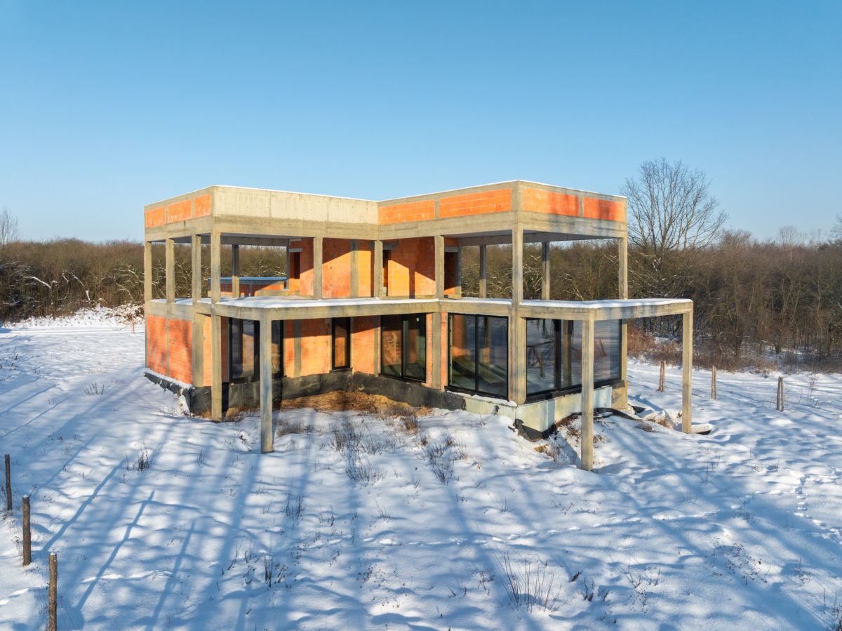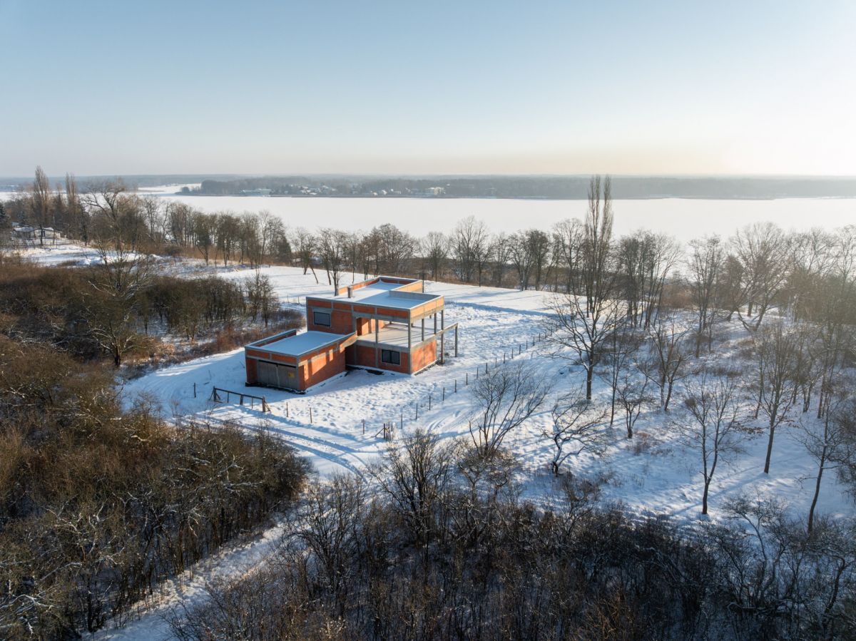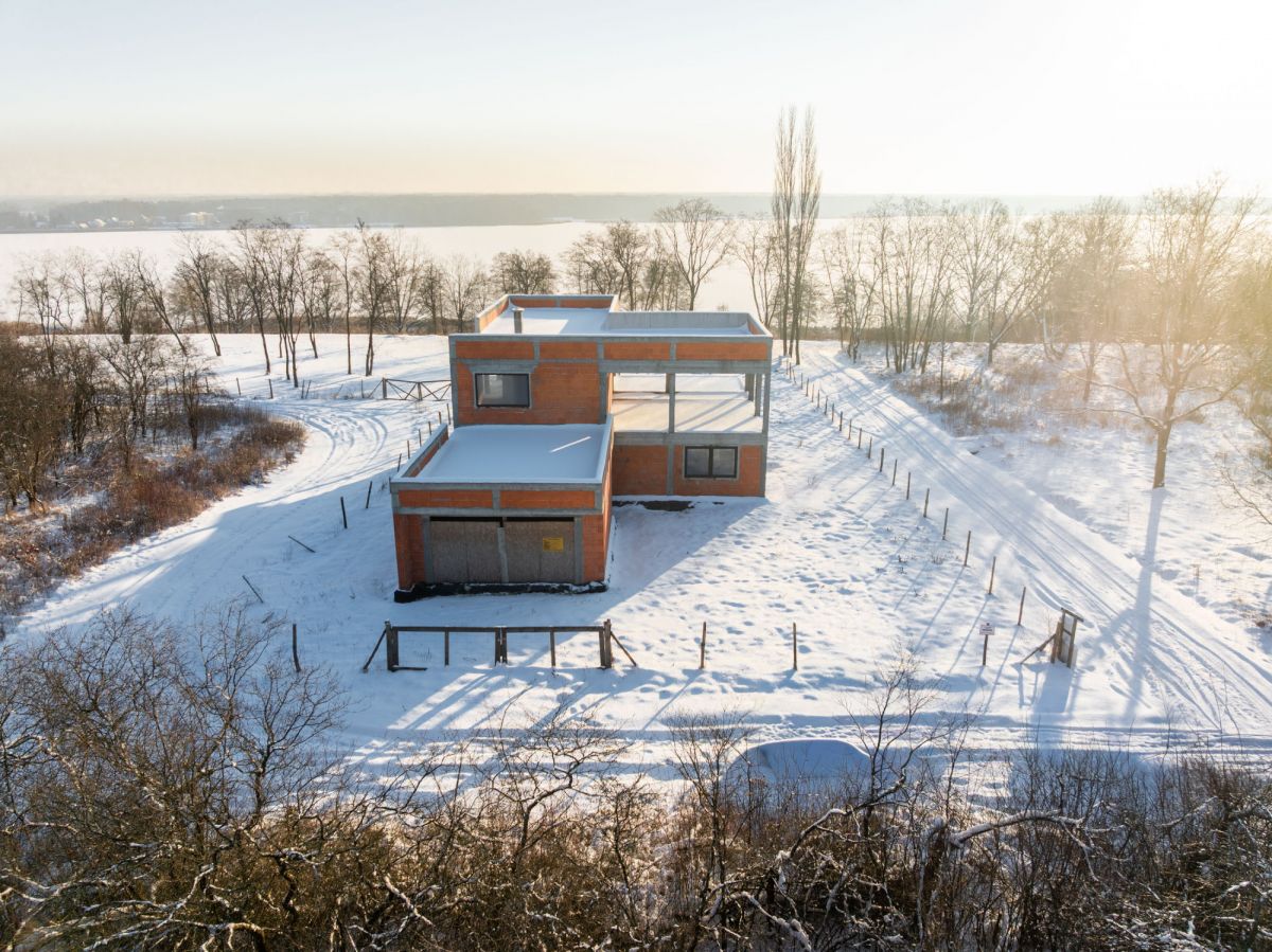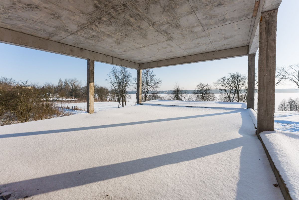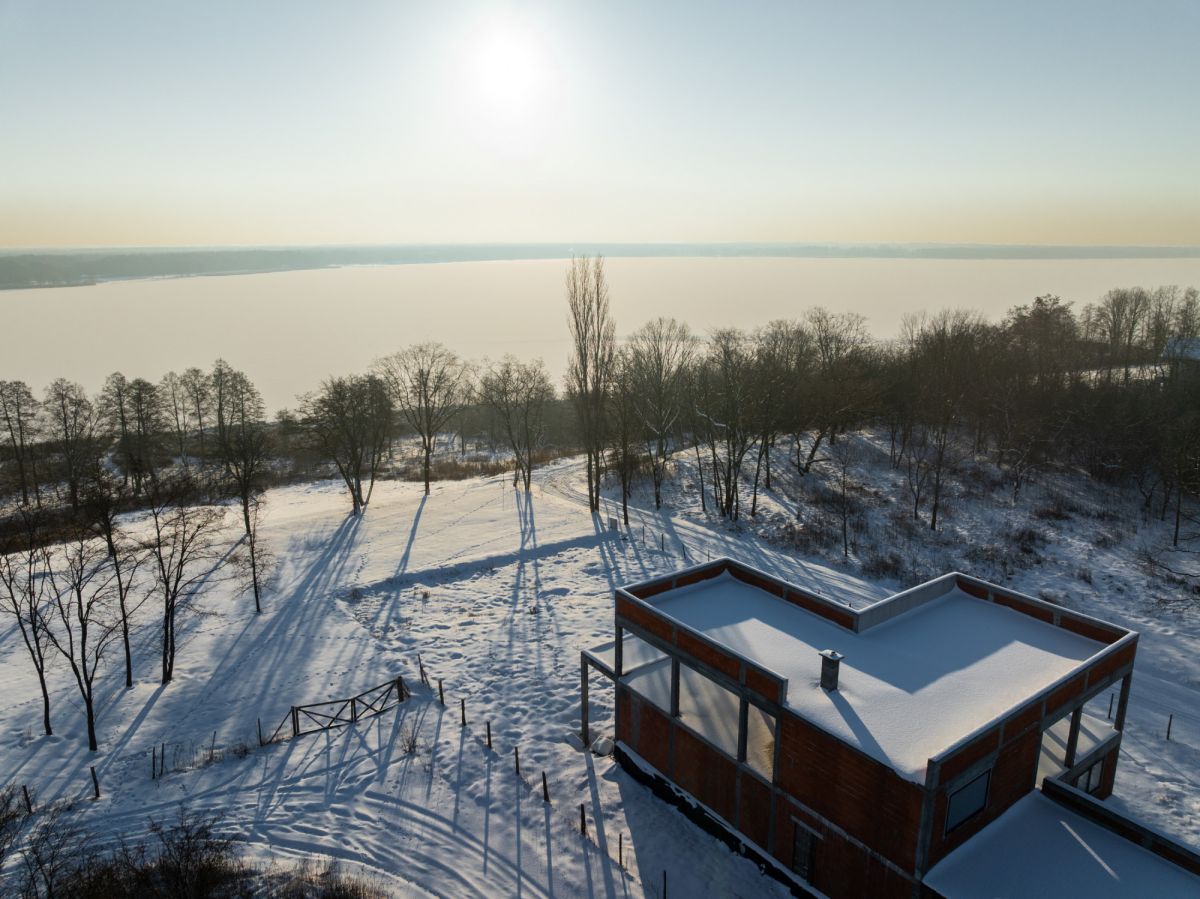 Obecnie na działce znajduje się dom w stanie surowym o nowoczesnej, modernistycznej architekturze. Projekt został stworzony tak, aby maksymalnie wykorzystać walory otoczenia - liczne przeszklenia sprawiają, że jezioro staje się integralną częścią wnętrza.