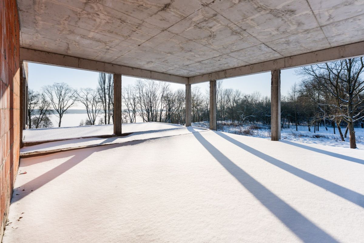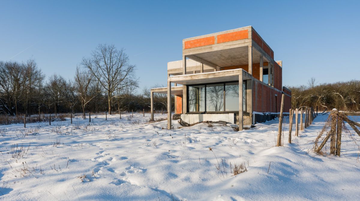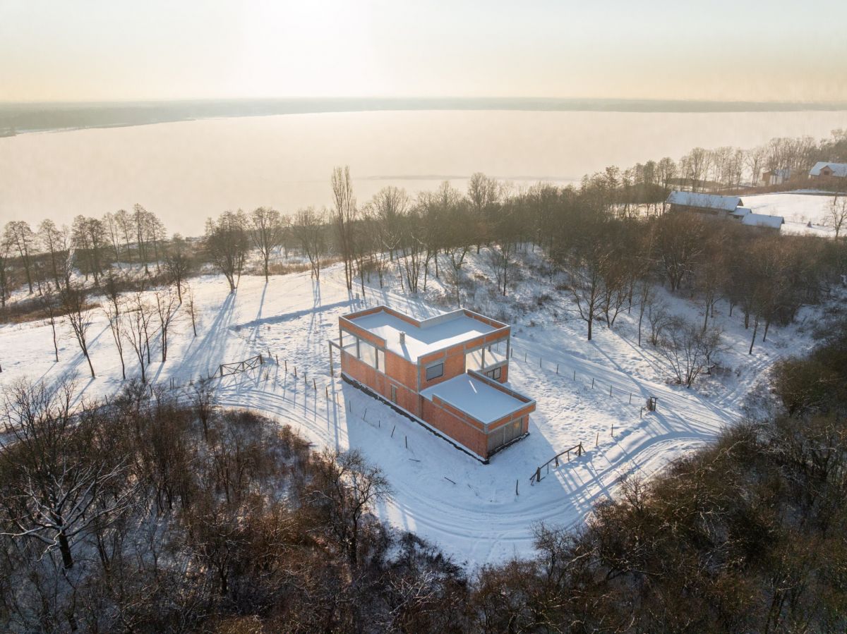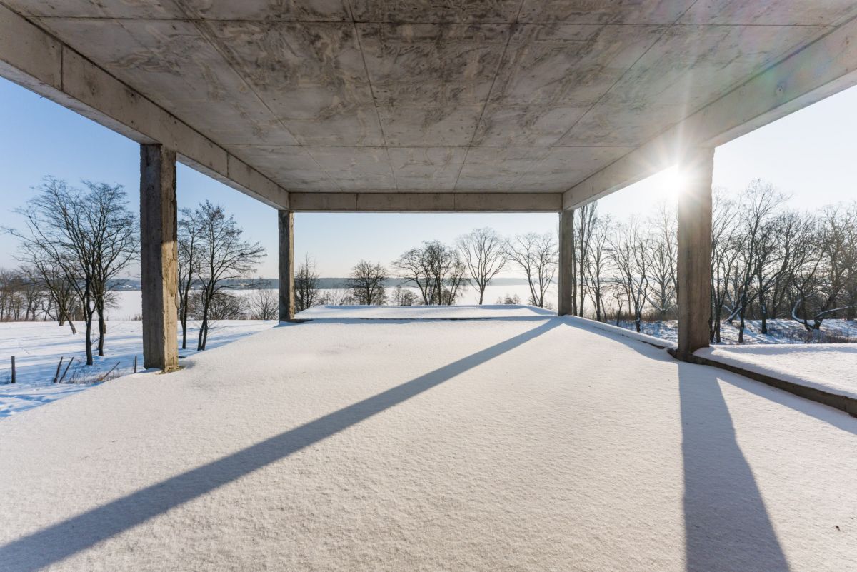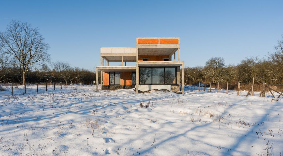 Obecnie na działce znajduje się dom w stanie surowym o nowoczesnej, modernistycznej architekturze. Projekt został stworzony tak, aby maksymalnie wykorzystać walory otoczenia - liczne przeszklenia sprawiają, że jezioro staje się integralną częścią wnętrza.