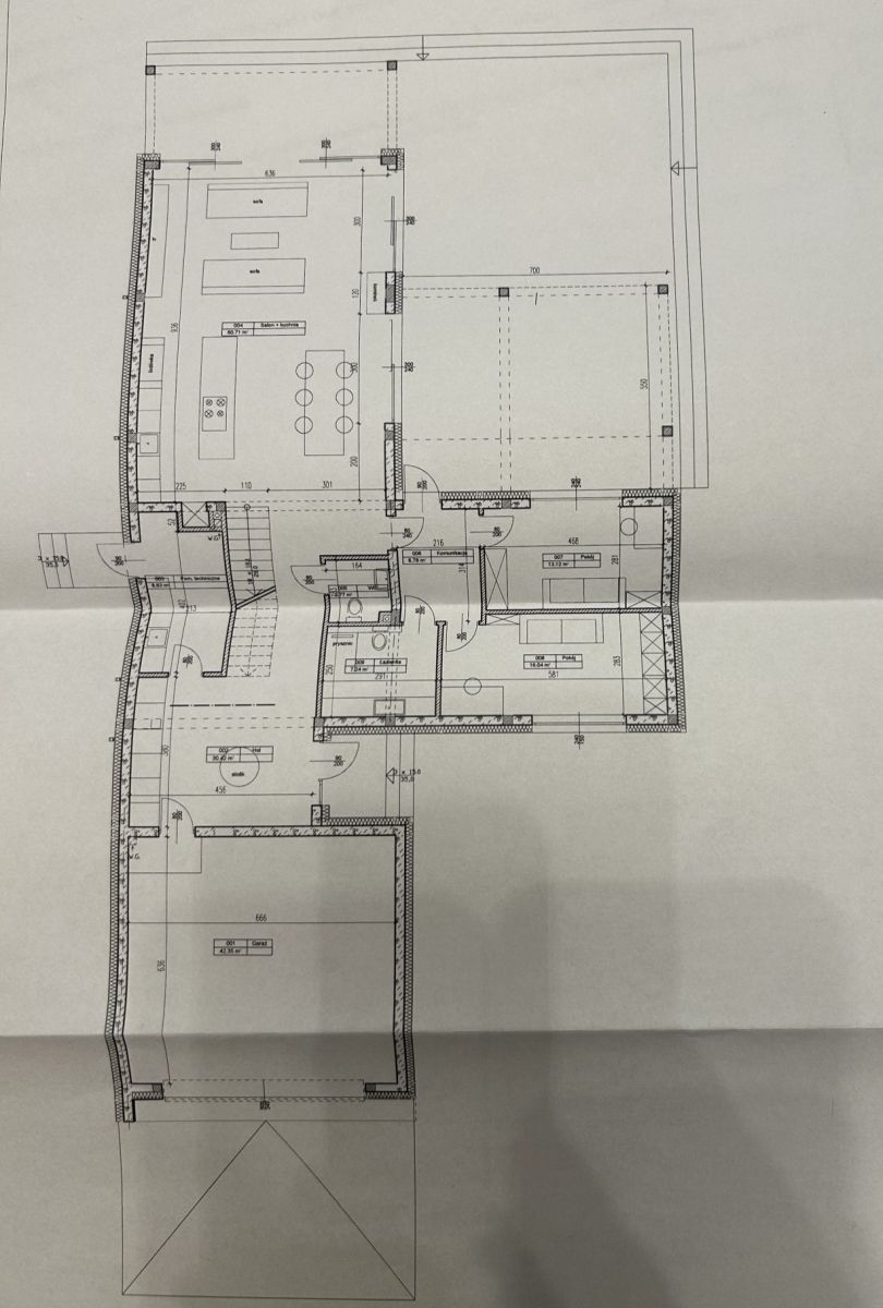 Parter (strefa dzienna i gościnna): Sercem domu jest salon z kuchnią o imponującej powierzchni 60,71 m². Na tym poziomie znajduje się również gabinet, pokój gościnny, dwie łazienki oraz przestronny garaż dwustanowiskowy (42 m²). Relaks zapewniają dwa tarasy o łącznej powierzchni blisko 57 m².