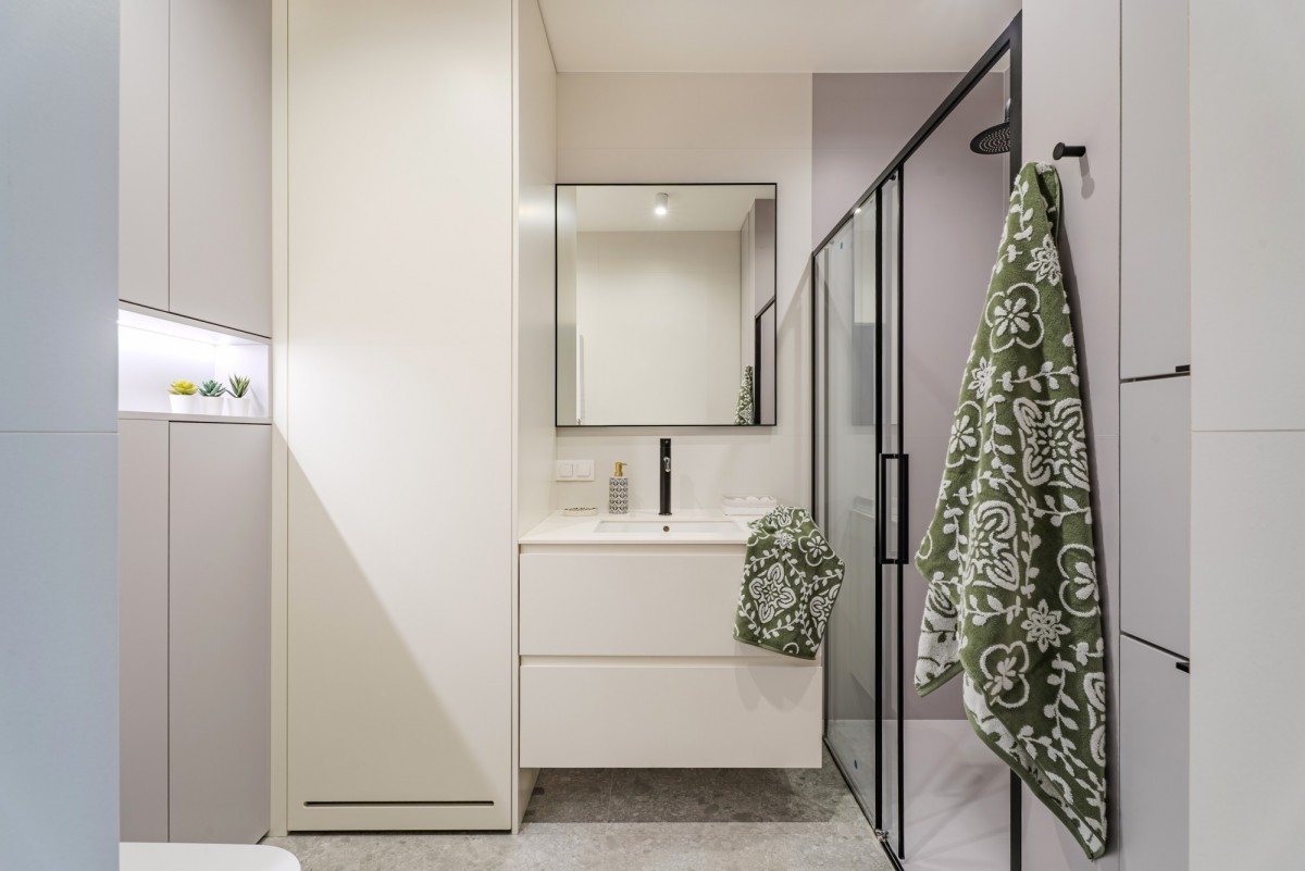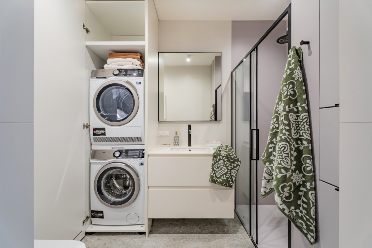 Na piętrze domu znajdują się 2 przestronne sypialnie (17,2 m2 oraz 21,8 m2) i łazienka z prysznicem oraz pralką i suszarką w zabudowie. Z głównej sypialni prowadzi wyjście na loggię (7,9 m2).
