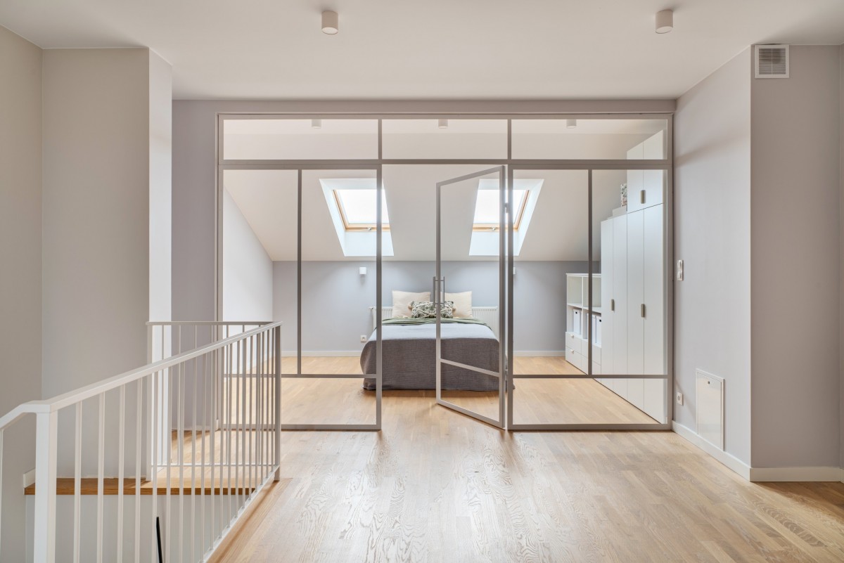 Poddasze składa się z 3 pomieszczeń; dwa skrajne mogą służyć jako sypialnie lub pomieszczenia do pracy, a środkowe zostało zaprojektowane jako drugi salon.
