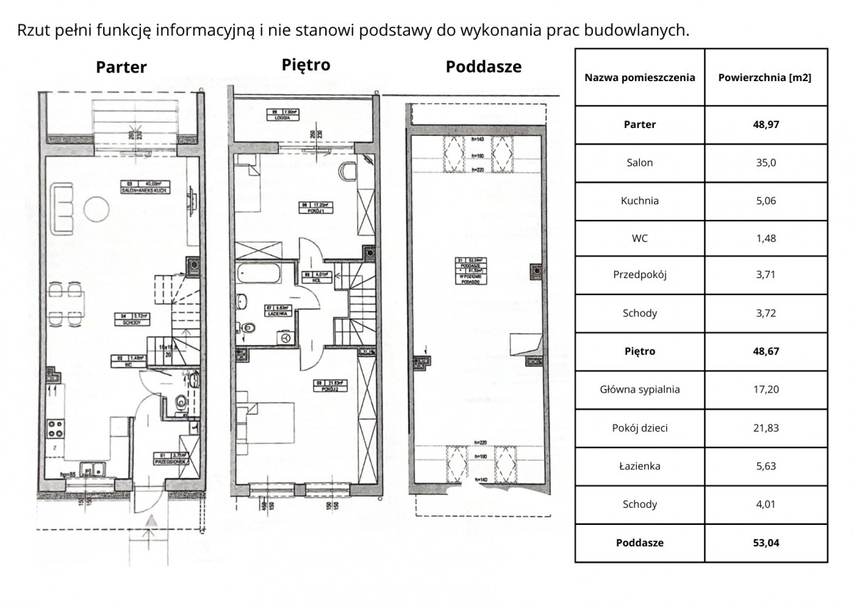 - Parter - 49 m2, piętro - 49 m2, poddasze - 53 m2 pow. użytkowej + strych