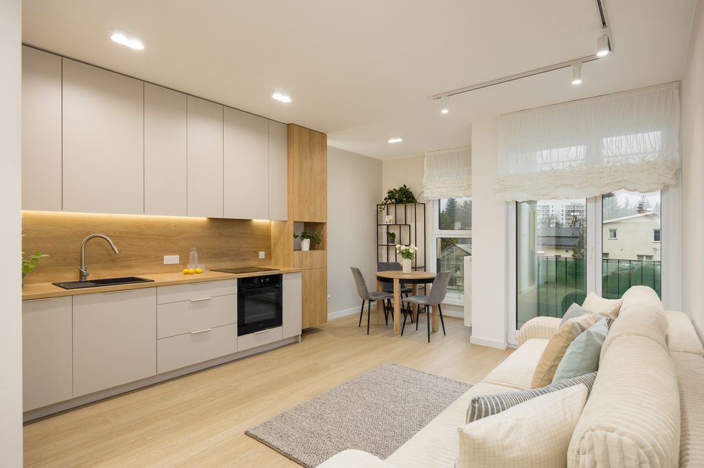 – Przestronny salon z aneksem kuchennym – jasna, dobrze doświetlona część dzienna z dużymi przeszkleniami oraz kuchnią wykonaną na zamówienie – pełne wyposażenie w sprzęt AGD marek Samsung, Bosch oraz Whirlpool