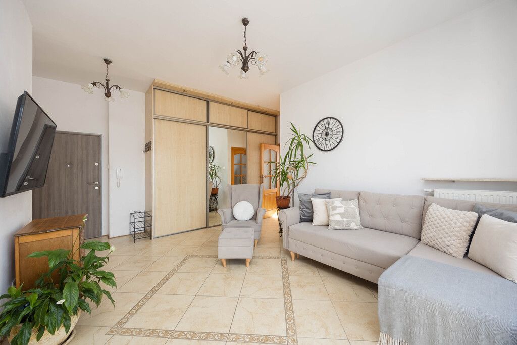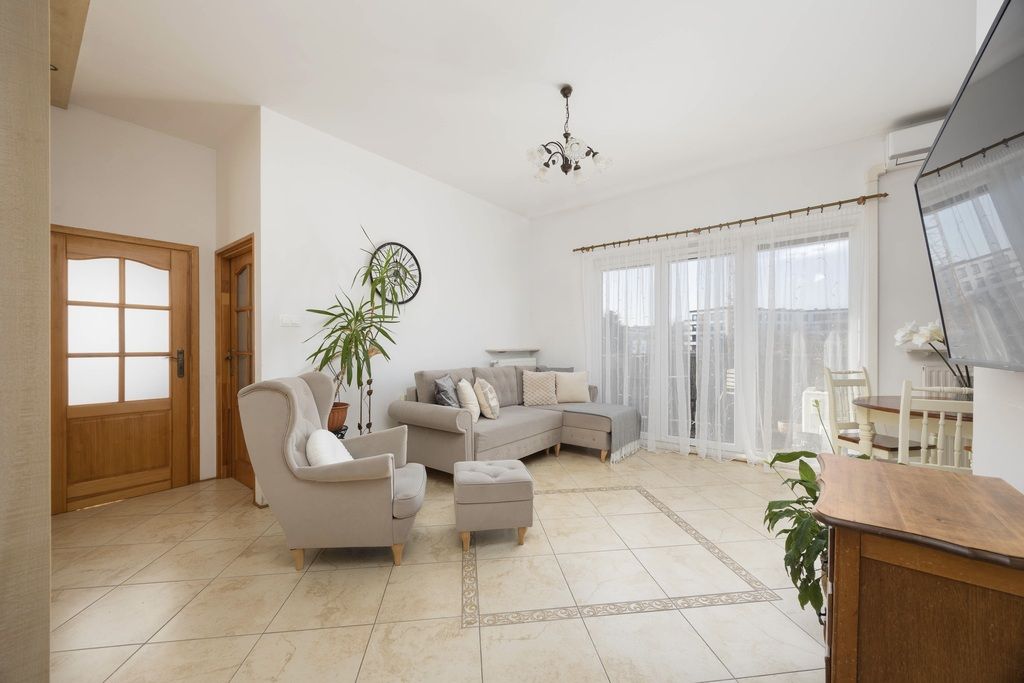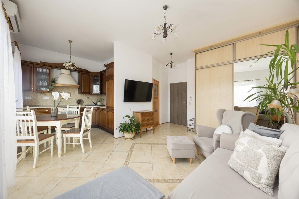 Mieszkanie w dobrym stanie wizualnym i technicznym, kupione od dewelopera w 2014 roku, wykończone w klasycznym i ponadczasowym stylu. Dużą ilość naturalnego światła zapewnia najbardziej pożądana południowo - zachodnia ekspozycja. Drzwi wejściowe antywłamaniowe, domofon. Na podłogach w salonie i kuchni gres, w pokojach parkiet z naturalnego drewna, w łazience płytki. Salon łączy funkcję wypoczynkową i jadalnianą, wraz z otwartą kuchnią i wyjściem na słoneczny balkon. W salonie znajduje się duża szafa z przesuwanymi drzwiami wykonana na wymiar przez stolarza. W pełni wyposażona kuchnia, meble z frontami z naturalnego drewna oraz sprzęt AGD marki Beko, między innymi płyta indukcyjna (nowa, 2025r.), zmywarka (nowa, 2025r.), piekarnik, lodówka z zamrażarką. Dwa kolejne pokoje pełnią obecnie funkcję głównej sypialni oraz pokoju dziecka; możliwość zaaranżowania według własnych potrzeb, na przykład jako gabinet. W łazience znajduje się narożna wanna, meble i toaleta. Dużym atutem mieszkania jest zlokalizowanie w części osiedla oddalonej od ulicy, mieszkanie jest bardzo ciche. W mieszkaniu zamontowano system klimatyzacji, który zapewnia komfort mieszkańcom podczas letnich dni; klimatyzacja jest regularnie serwisowana. Wysokie pomieszczenia, ponad 3m.