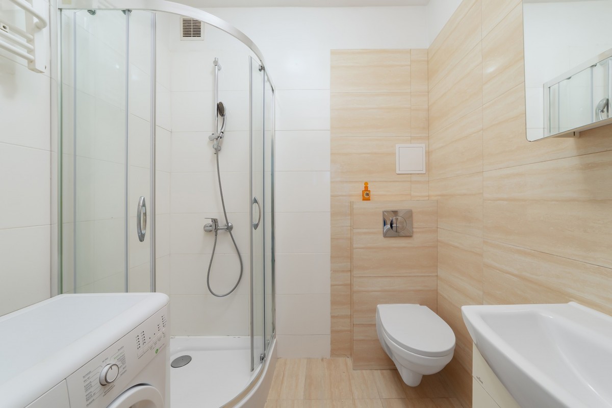 Łazienka została wykończona w neutralnych barwach, z kabiną prysznicową, pralką i toaletą podtynkową.