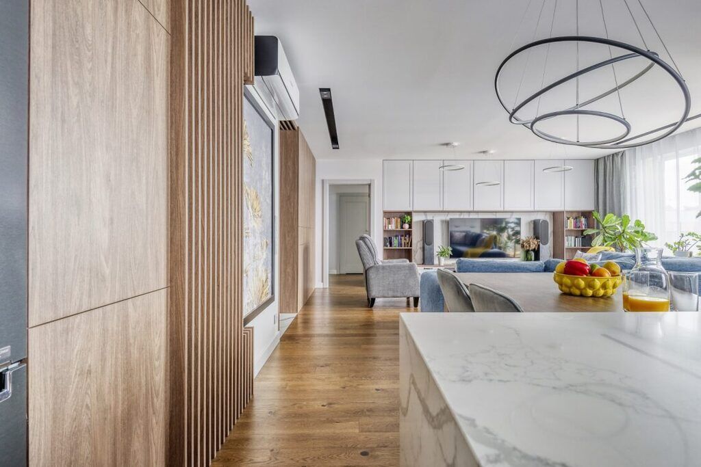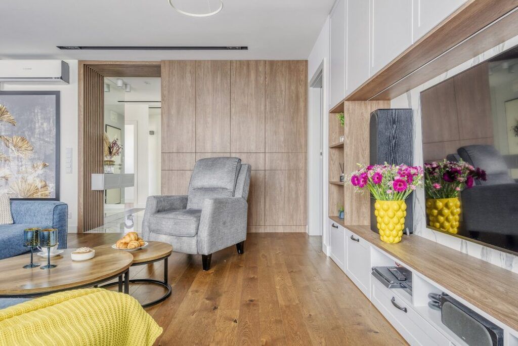 Opis mieszkania: Lokal o powierzchni 111,36 m² znajduje się na 7. piętrze nowoczesnego budynku z windą. Został zaprojektowany przez architekta wnętrz z naciskiem na funkcjonalność, przestrzeń oraz liczne rozwiązania do przechowywania. W skład mieszkania wchodzą:
