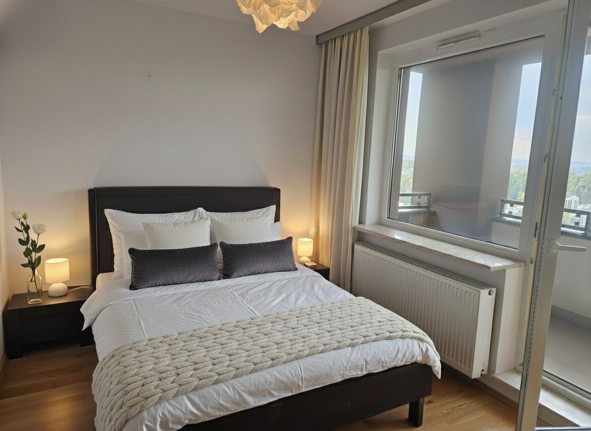 - Sypialnia główna - przestronna, klimatyzowana i ustawna, oferująca ten sam imponujący widok na centrum miasta. Posiada bezpośrednie wyjście na loggię - idealne miejsce na poranną kawę z widokiem na miasto. Do sypialni przylega duża, prywatna garderoba.