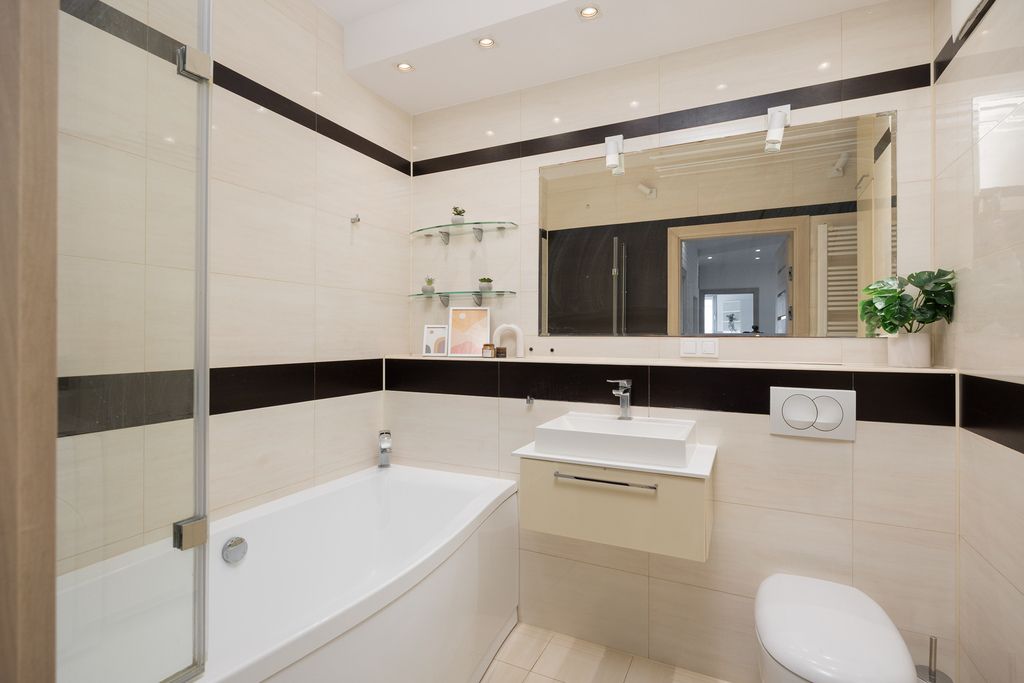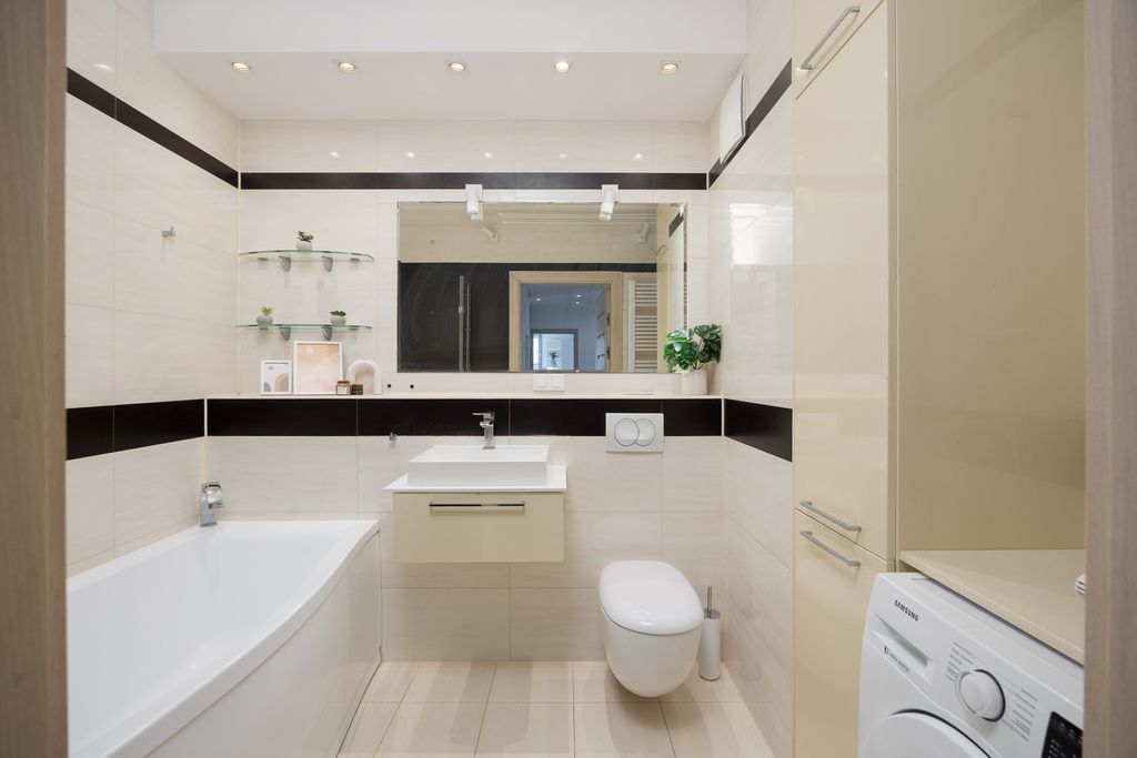 – łazienka z wanną, wc, zabudowaną szafą i miejscem na pralkę (5,2 m²),
