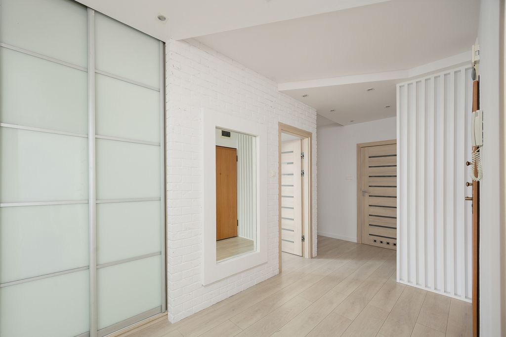 Wnętrze mieszkania jest utrzymane w stonowanej, neutralnej kolorystyce. Na podłogach znajdują się panele oraz gres. Mieszkanie jest dobrze doświetlone – dzięki ekspozycji okien na południe i wschód światło dzienne dociera do wszystkich pomieszczeń przez większość dnia.