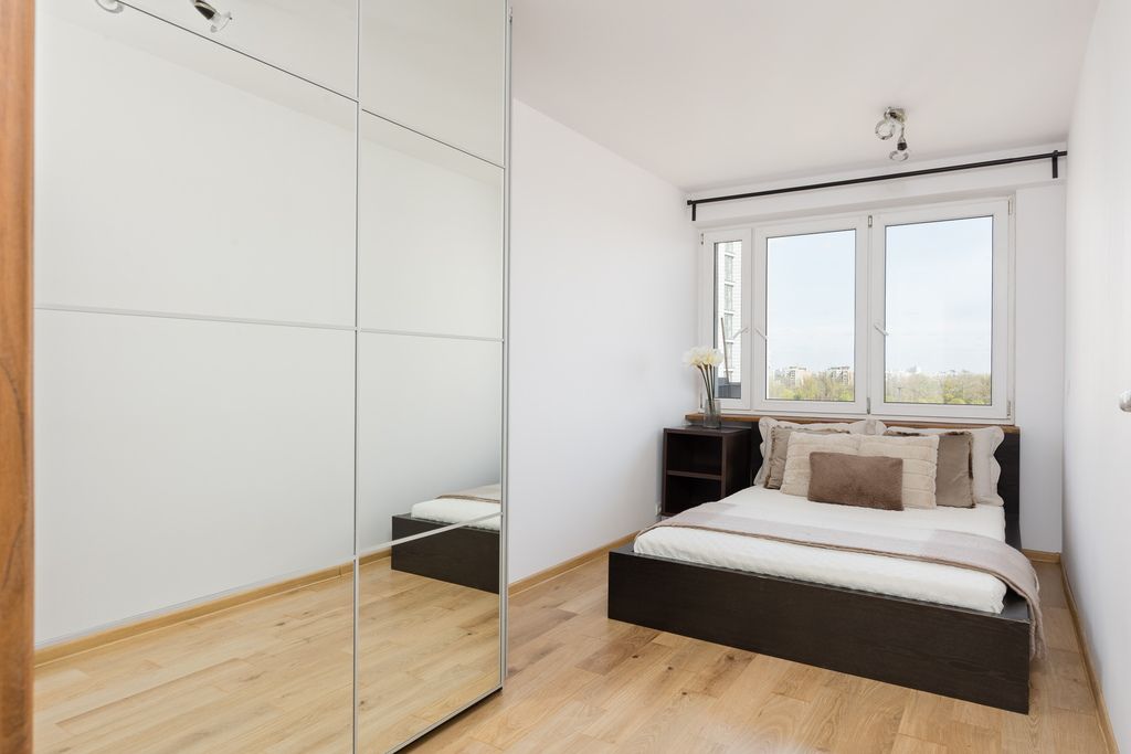 Gotowe do zamieszkania, dwupokojowe mieszkanie z balkonem i widokiem na Wisłę, położone na dziewiątym piętrze szesnastopiętrowego budynku z windą z 1968 roku, zlokalizowane na warszawskim Powiślu przy ul. Fabrycznej 2.