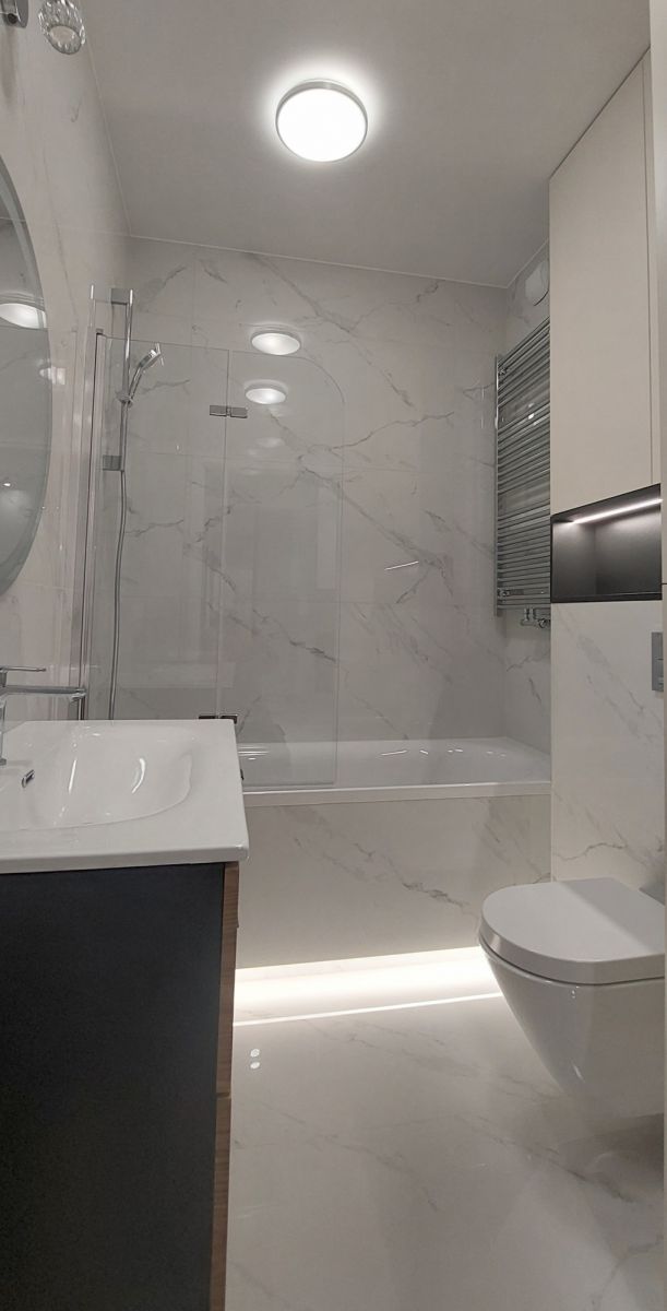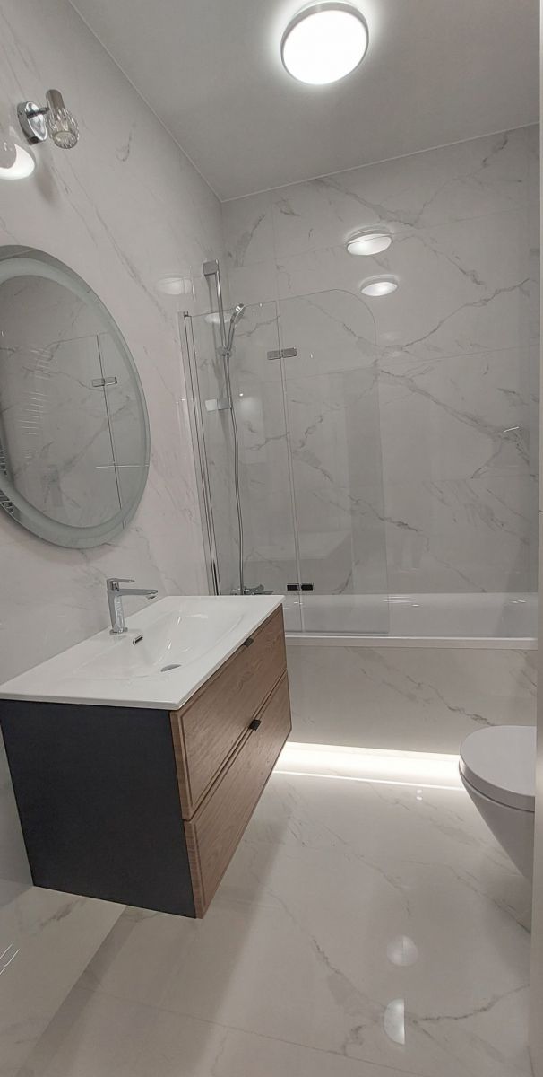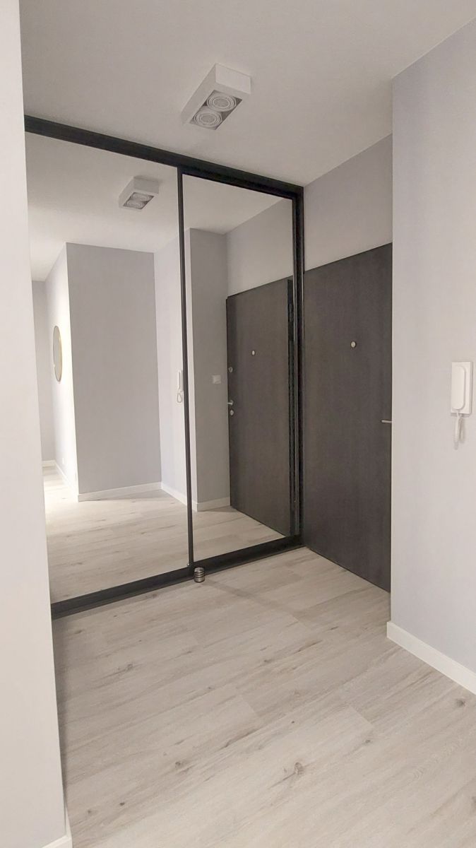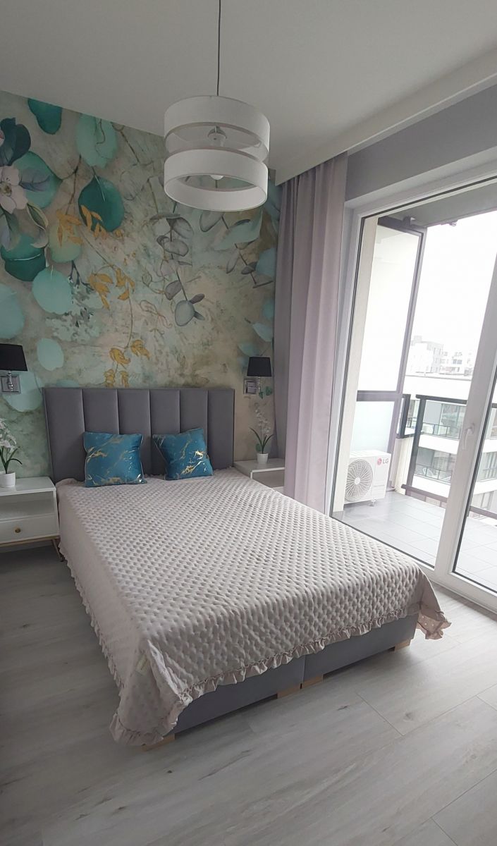 i składa się z salonu z otwartą kuchnią przedzieloną miejscem do pracy lub spożywania posiłków, sypialni, przedpokoju oraz łazienki z wc. Mieszkanie, dotychczas jeszcze nigdy nie wynajmowane, posiada klimatyzację oraz wyposażone jest w nowy sprzęt AGD (piekarnik, płyta indukcyjna, zmywarka do naczyń, lodówka). W salonie znajduje się sofa, szafka pod RTV oraz stół z czterema krzesłami, a w sypialni duże łóżko małżeńskie, szafki nocne i pojemna szafa. W łazience jest wanna z prysznicem, pralka i umywalka z szafką, a w obszernym korytarzu wbudowana jest pojemna szafa z lustrzanymi drzwiami. W każdym pomieszczeniu zamontowano nowoczesne i gustowne oświetlenie.