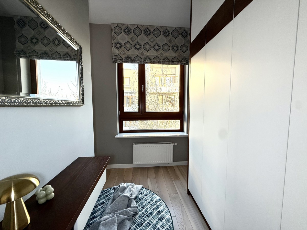 Apartament mieści się na 2. piętrze eleganckiego budynku z windą, w sercu Miasteczka Wilanów.