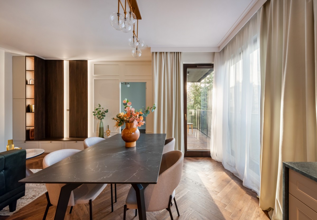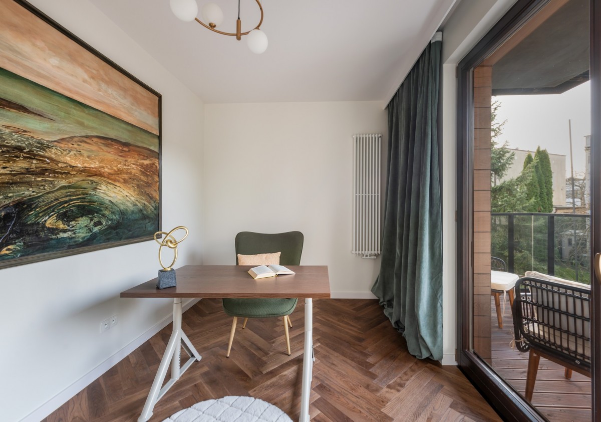 Wnętrze mieszkania wykończone zostało z wyjątkową starannością i dbałością o detale, przy użyciu materiałów najwyższej klasy. Na podłogach położono klejoną deskę dębową, która nadaje przestrzeni naturalnego ciepła i elegancji. Kuchnia oraz łazienki zostały wyposażone w blaty z litego granitu, a ściany w łazienkach wykończono sprowadzanymi z Hiszpanii płytkami, wyróżniającymi się unikalnym designem i wysoką jakością. Wszystkie meble zostały wykonane na zamówienie - w całości lakierowane, co podkreśla spójność i luksusowy charakter wnętrza. Całość uzupełniają drzwi wewnętrzne renomowanej firmy DRE, a także dwie jednostki klimatyzacji, zapewniające komfort niezależnie od pory roku.