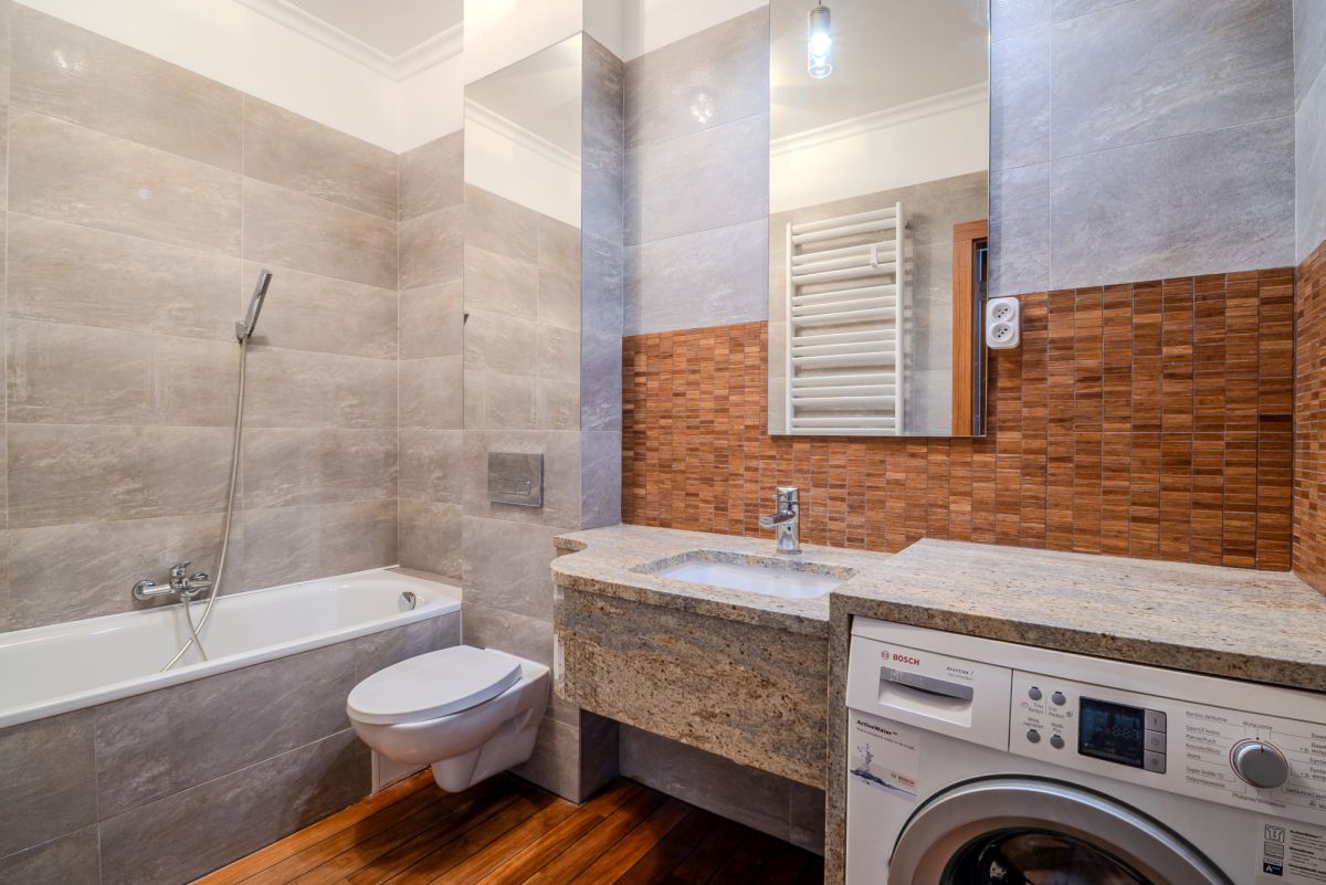 Mieszkanie wykończone jest w sposób bardzo estetyczny i trwały, z użyciem materiałów wysokiej jakości- m. in. na podłogach ułożony jest parkiet drewniany - naturalny, ciepły w odbiorze, natomiast łazienka wyróżnia się elegancką zabudową wykonaną na wymiar z marmuru