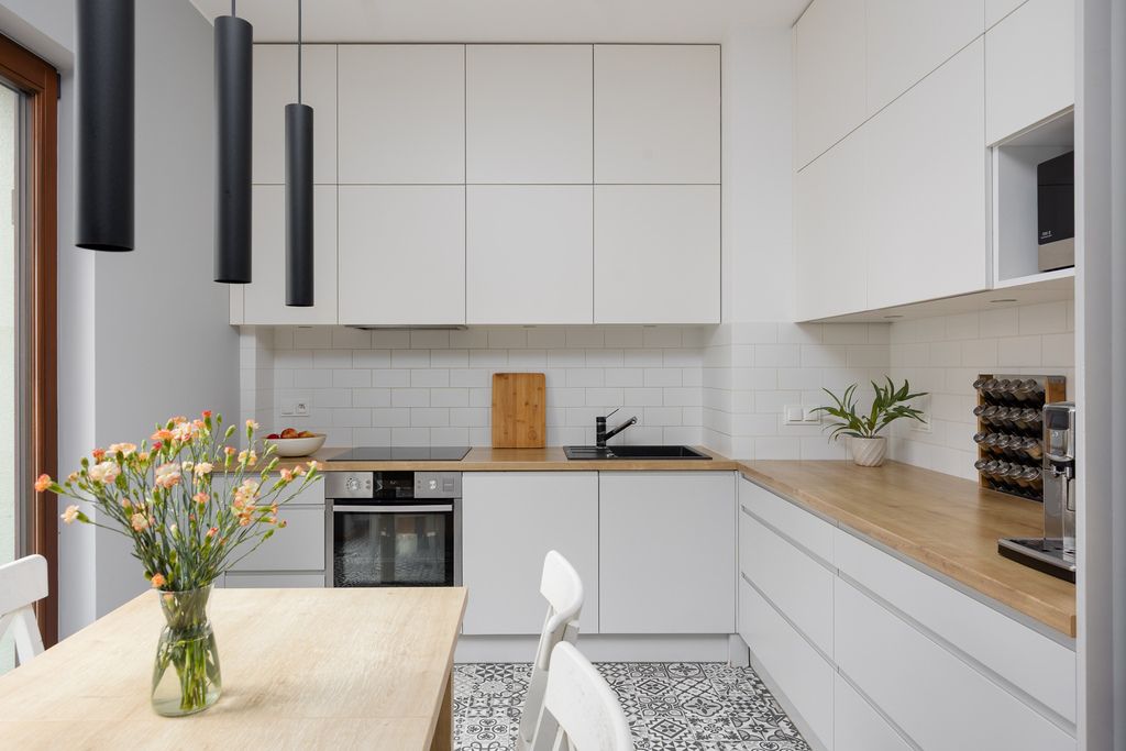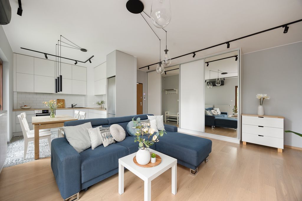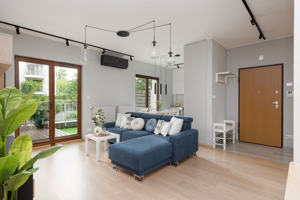 - salon z aneksem kuchennym (32,91 m²) – serce mieszkania, przestronny, słoneczny, z dużymi panoramicznymi oknami i klimatyzacją. Bezpośrednie wyjście prowadzi do głównego ogródka z tarasem, co tworzy idealne miejsce do wspólnego spędzania czasu i relaksu,