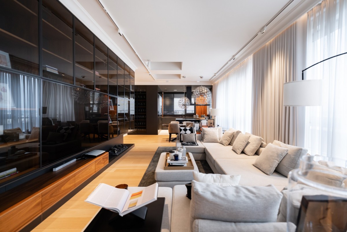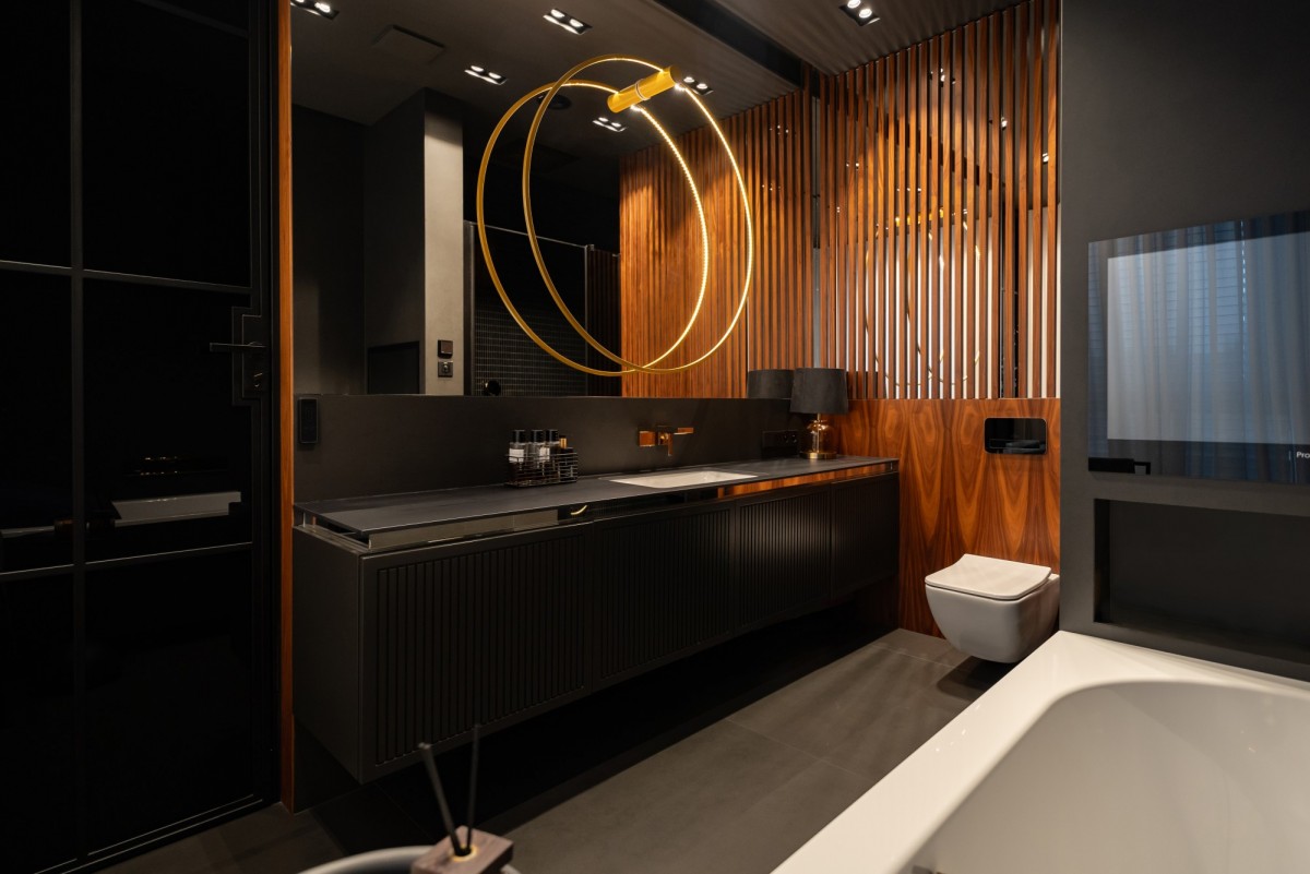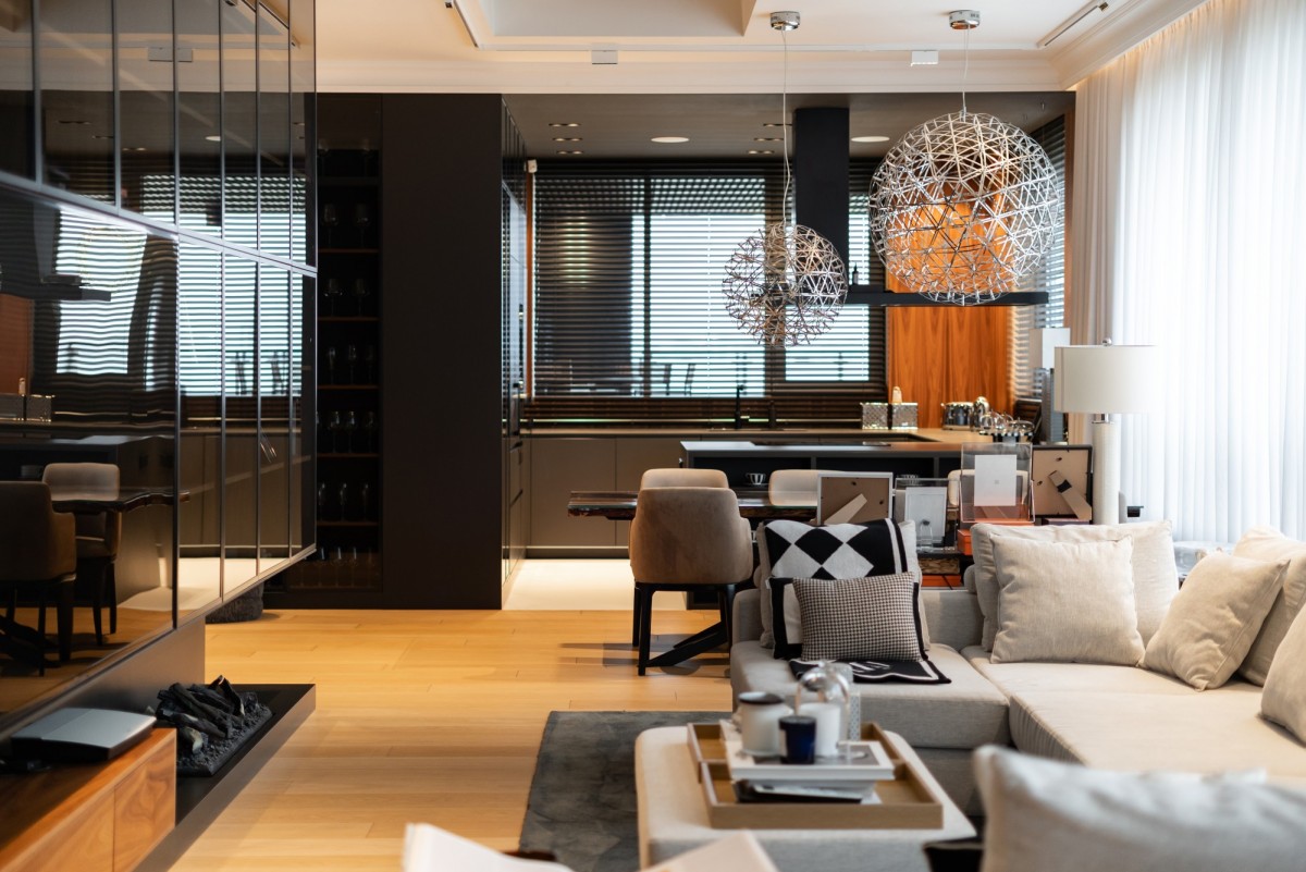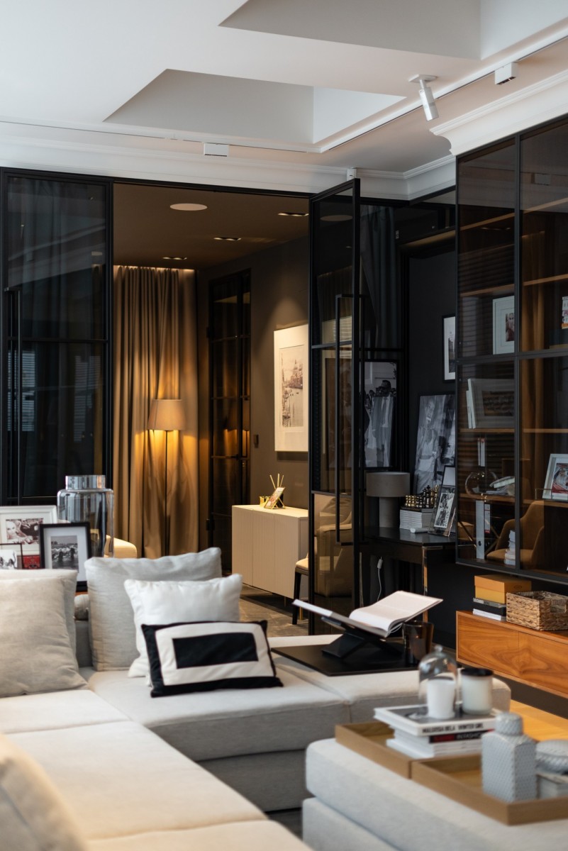 Całość wykończona z użyciem materiałów najwyższej jakości: naturalny dębowy parkiet, starannie dobrane przeszklenia, światowej klasy armatura i zabudowy stolarskie. Kolorystyka oparta na eleganckich szarościach, czerni i drewnie nadaje wnętrzu ponadczasowy charakter.