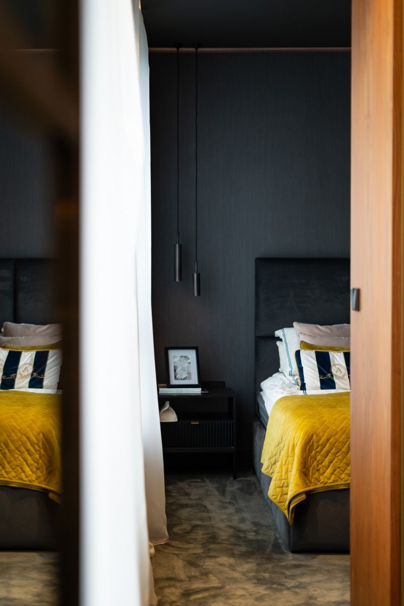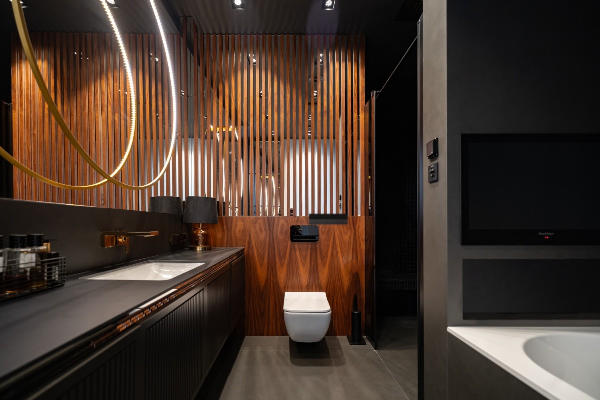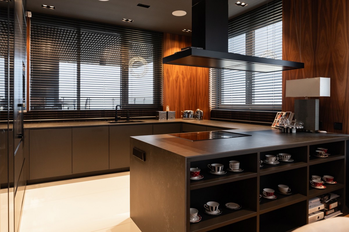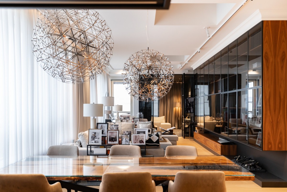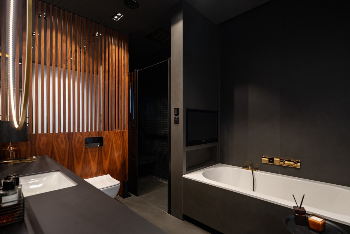 Całość wykończona z użyciem materiałów najwyższej jakości: naturalny dębowy parkiet, starannie dobrane przeszklenia, światowej klasy armatura i zabudowy stolarskie. Kolorystyka oparta na eleganckich szarościach, czerni i drewnie nadaje wnętrzu ponadczasowy charakter.