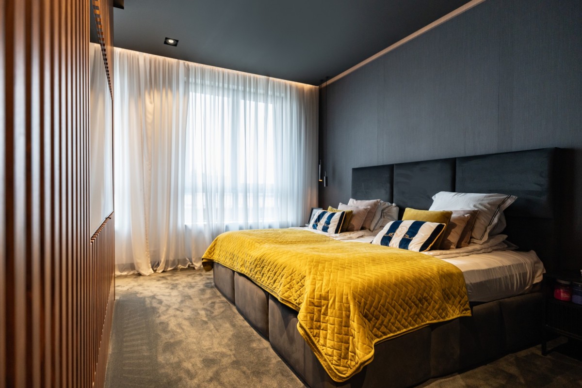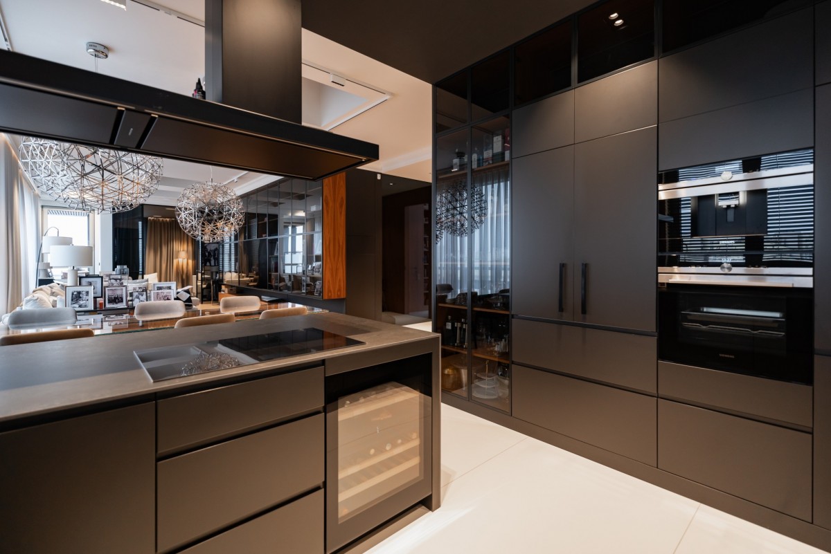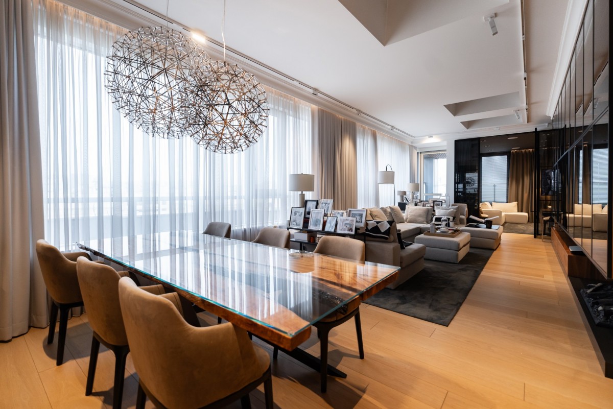 Apartament o powierzchni 173 m² zaprojektowany został jako luksusowy, spójny open space z wyraźnym podziałem funkcjonalnym. Sercem wnętrza jest przestronny, reprezentacyjny salon o imponującej wysokości, pełen światła i lekkości, połączony z otwartą kuchnią wyposażoną w wysokiej klasy sprzęt AGD, w tym lodówkę z kostkarką, chłodziarkę na wino, piekarnik, mikrofalę, zmywarkę oraz designerski okap marki FABER.