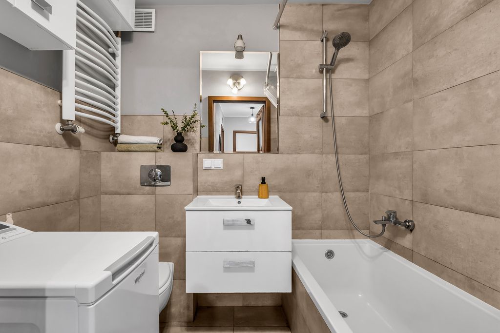 – oraz funkcjonalna łazienka i przemyślany układ pomieszczeń, który sprawia, że mieszkanie wydaje się większe niż wskazuje metraż.
