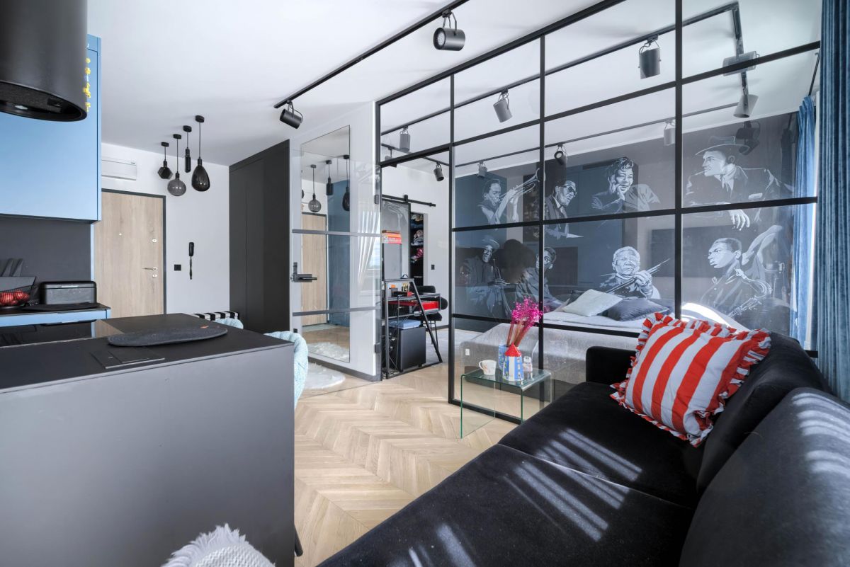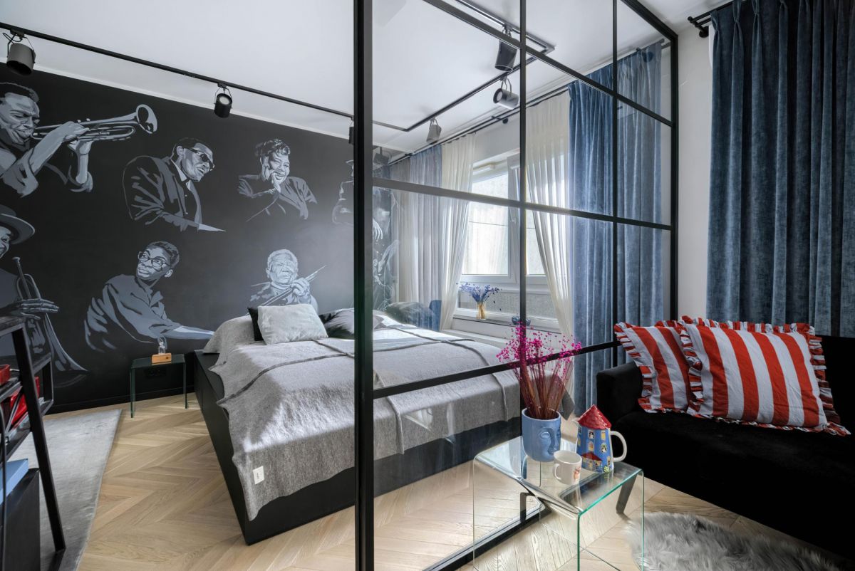 Przeszklona ścianka oddzielająca sypialnię od części dziennej optycznie powiększa przestrzeń, zapewniając jednocześnie intymność i doświetlenie wnętrza.