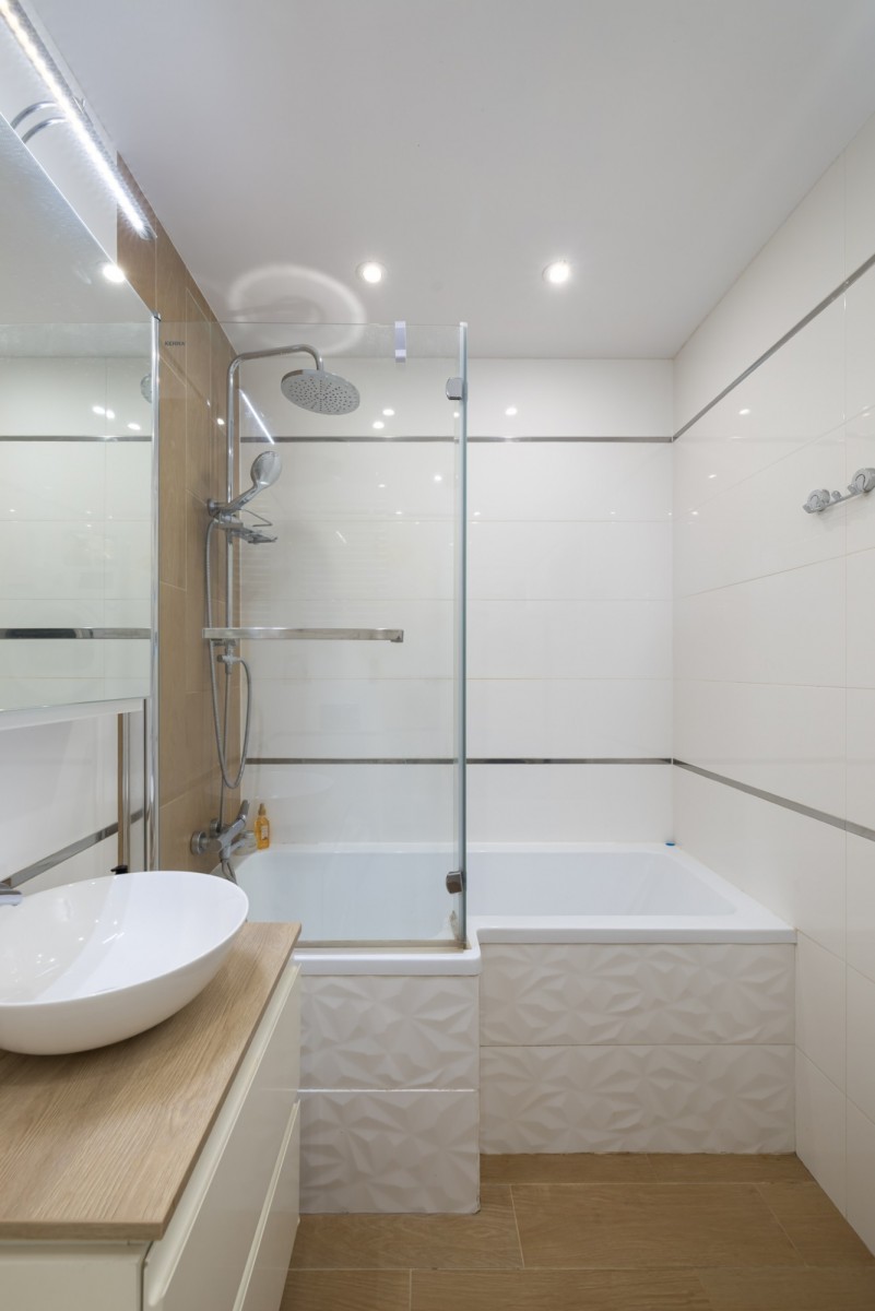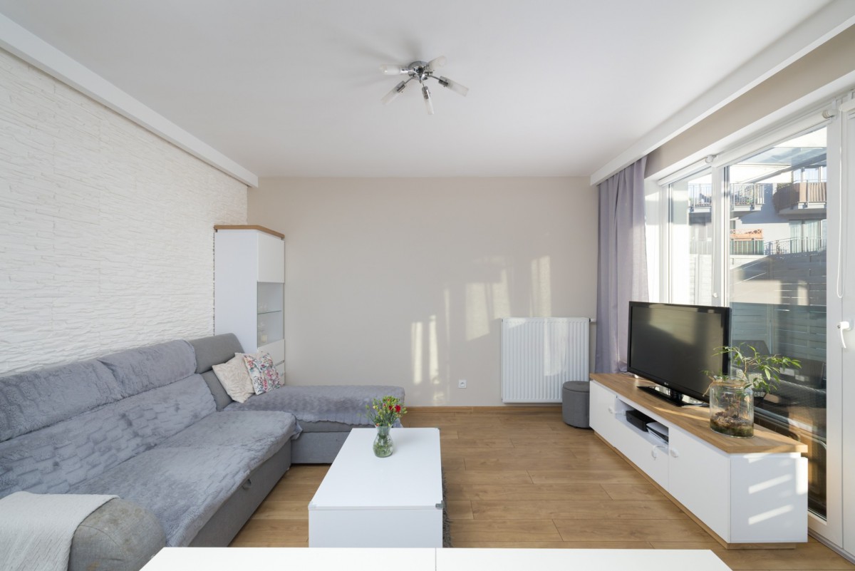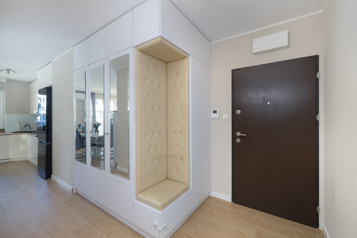 przestronny salon z aneksem kuchennym, wyposażonym w zabudowę oraz sprzęt AGD (bez lodówki), klimatyzację.