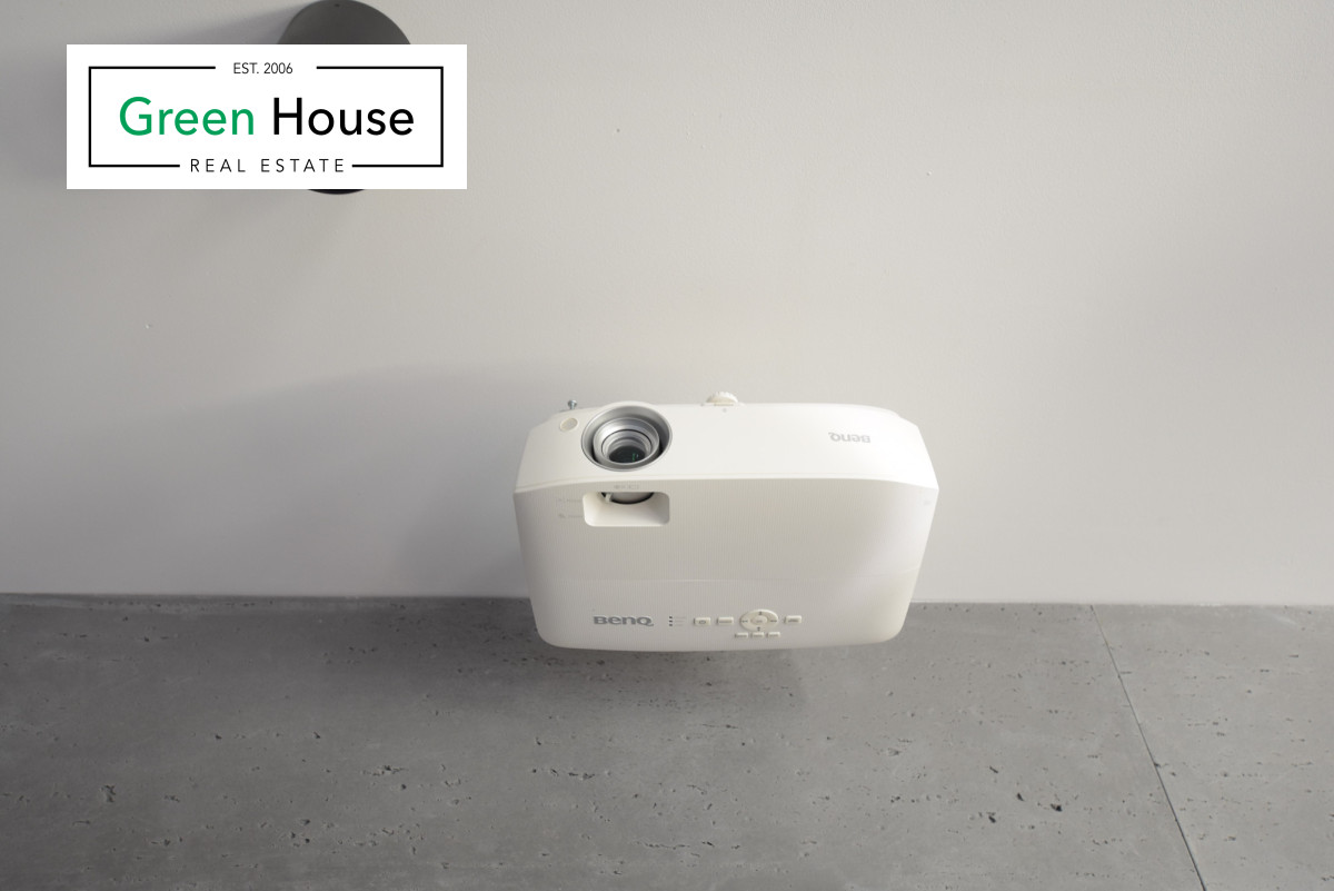 - w salonie sofa, szafka rtv, projektor Benq