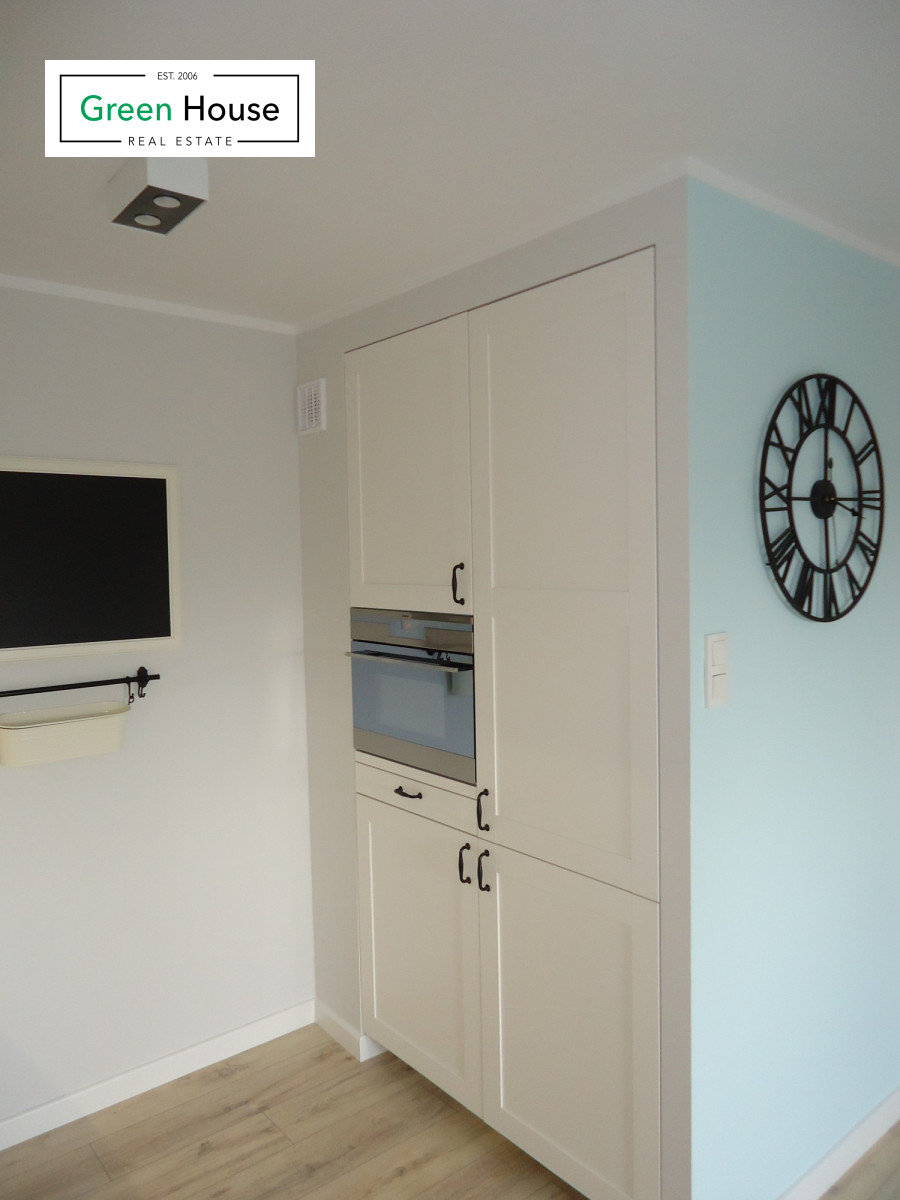 W kuchni zaprojektowano zabudowę na wymiar w kolorze białym i wyposażono w sprzęt AGD: lodówkę, płytę elektryczną, pralkę, zmywarkę, piekarnik z funkcją mikrofali.