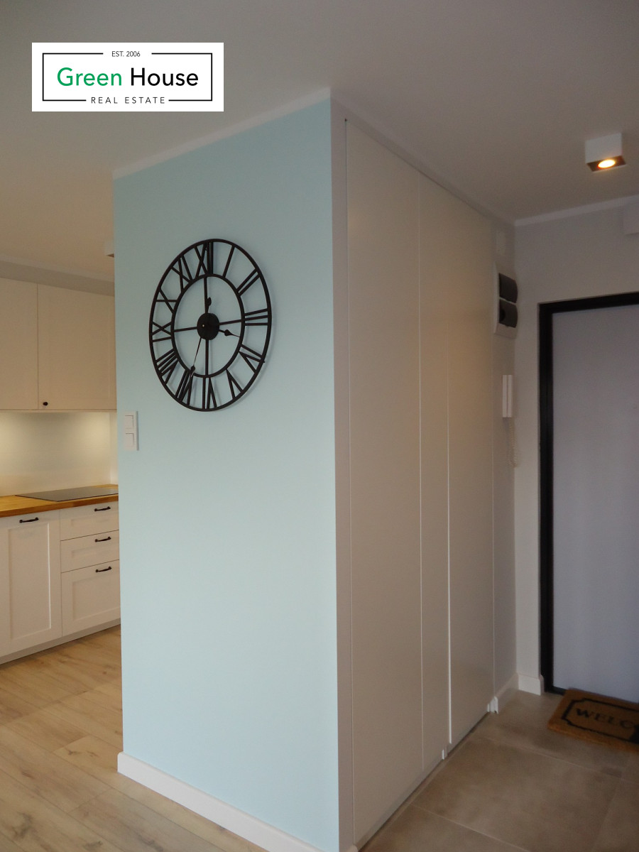Mieszkanie w pełni umeblowane i wyposażone. W salonie rozkładana 2-osobowa sofa, w przedpokoju szafa w kolorze białym, szafka TV, stół, 2 krzesła, stolik, dywan.