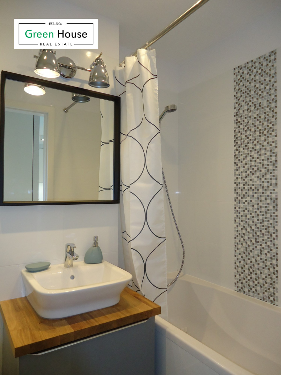 Łazienka z wanną umożliwiającą korzystanie zarówno z kąpieli jak i prysznica, wygodna szafka z umywalką, dodatkowa pojemna szafka na niezbędne kosmetyki oraz szafka na brudną bieliznę.