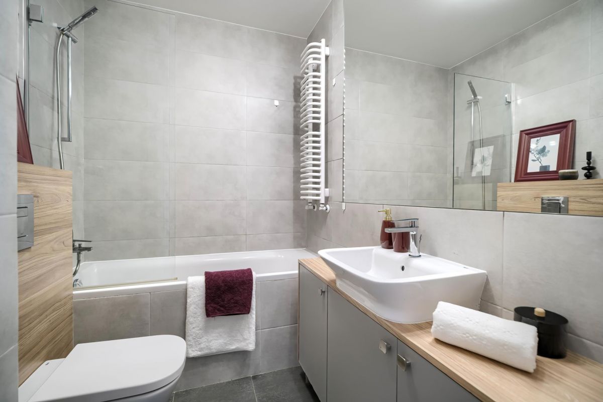 W łazience wanna z możliwością korzystania jak z prysznica, WC, umywalka.