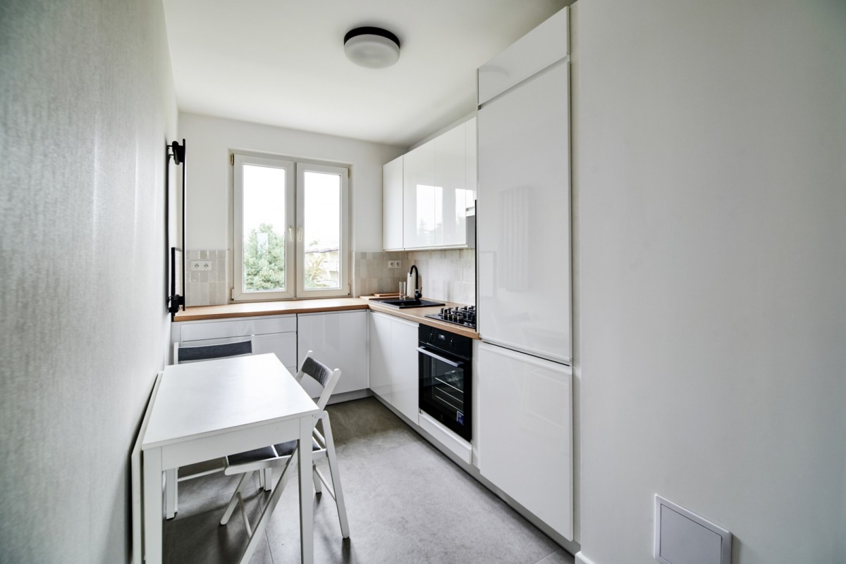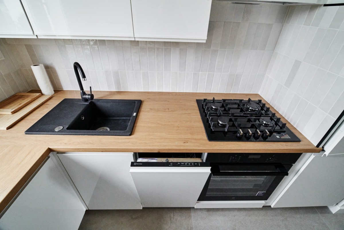 Kuchnia - 8 m2 wyposażona w nowy sprzęt (lodówka Electrolux, płyta gazowa Bosh, piekarnik Elektrolux, zmywarka Electrolux, pralka Whirlpool)