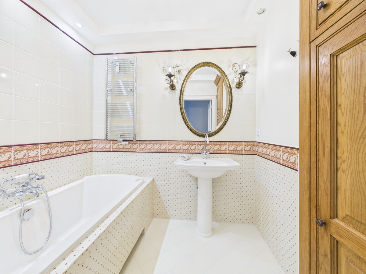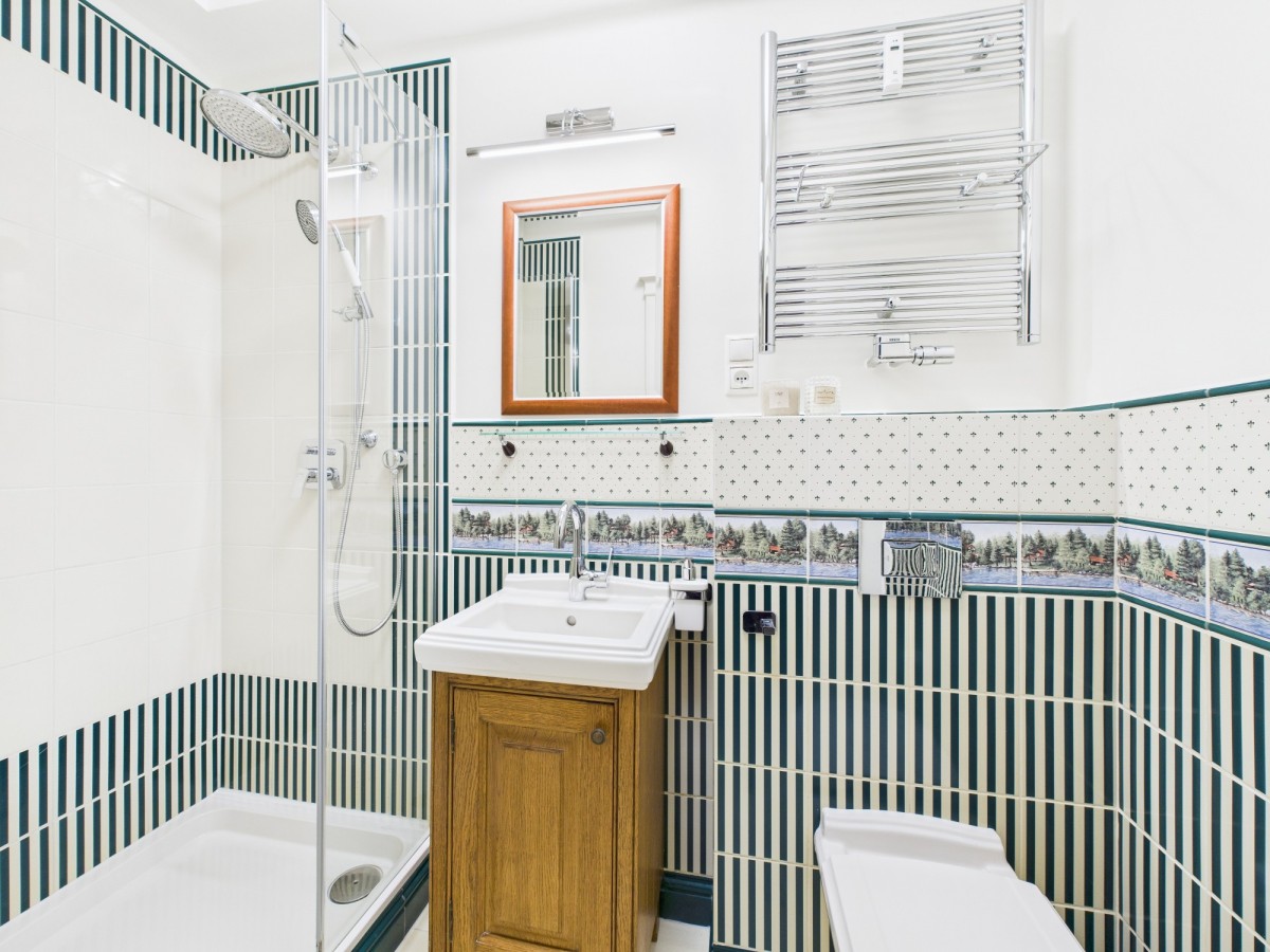 -dwie łazienki: jedna z prysznicem, umywalką i WC, druga z wanną i umywalką, toalea i umywalki Villeroy&Boch,