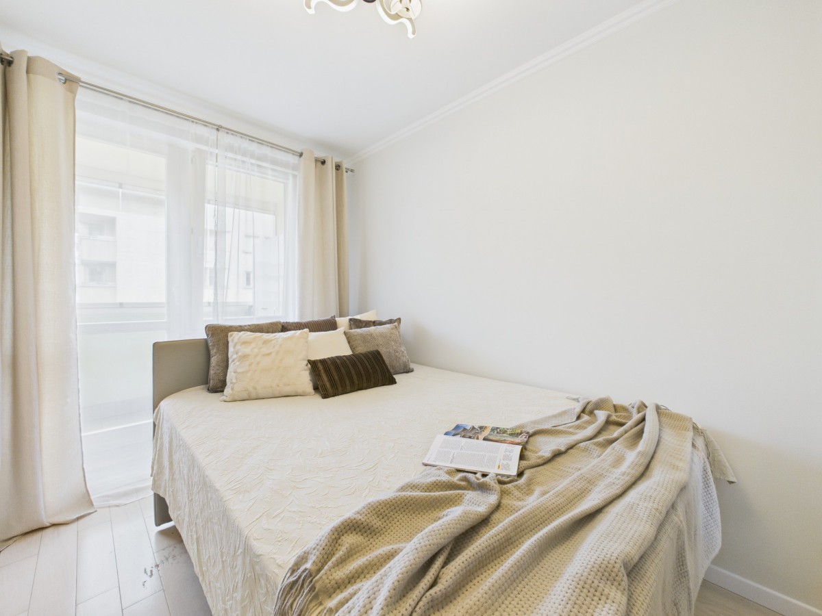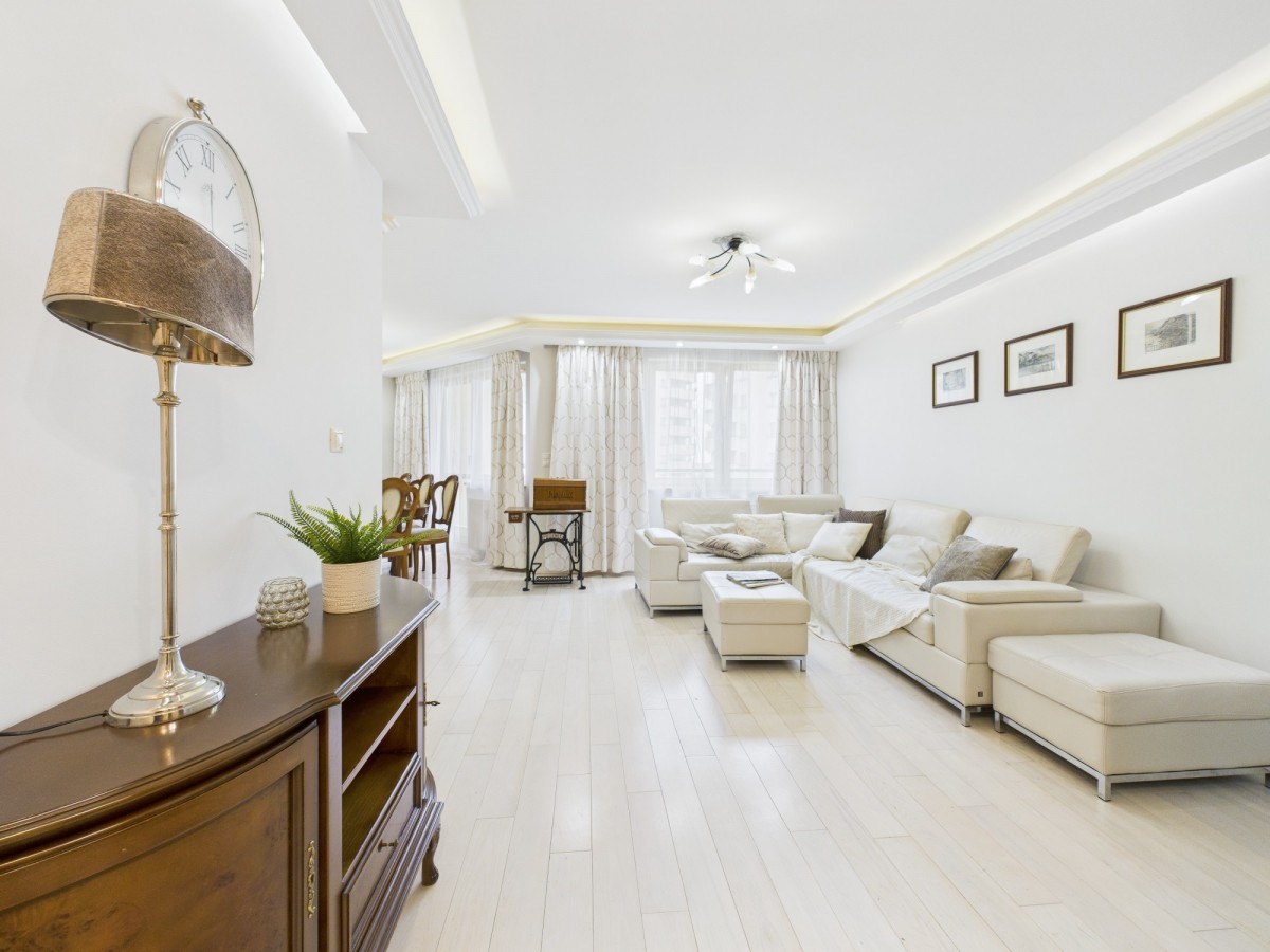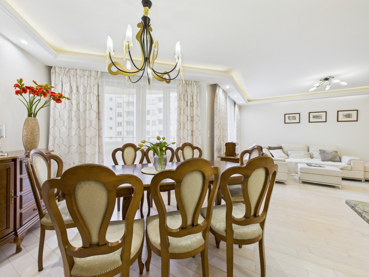 Mieszkanie wykończone w wysokim standardzie: bielona podłoga jesionowa, klasyczne meble Klera, kamienne blaty, kanapa skórzana w części dziennej, styl wnętrza klasyczny. Budynek z 2008 r., 15 pięter, winda, zadbane części wspólne, monitoring, ochrona.