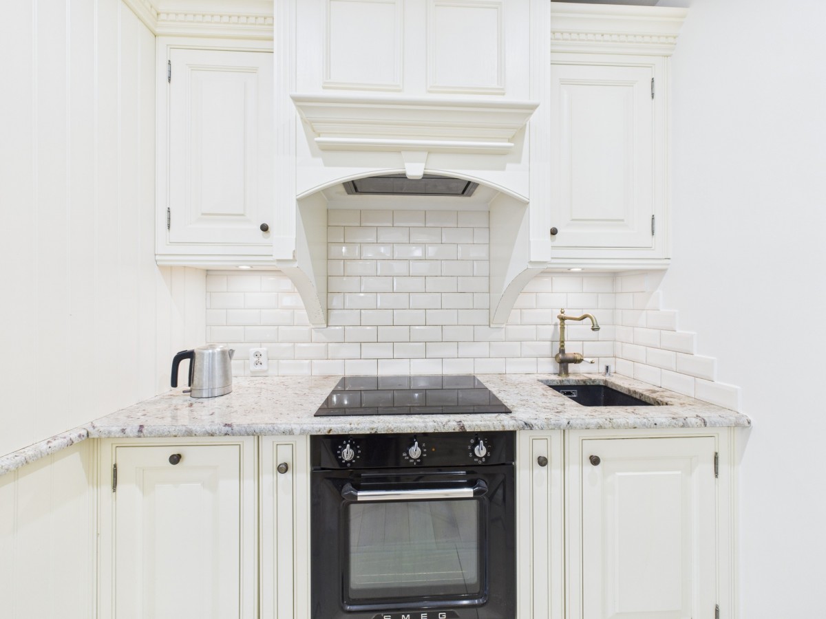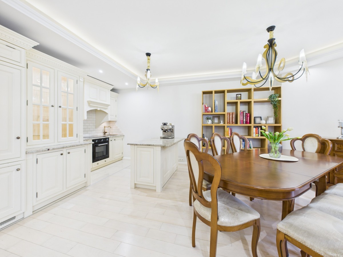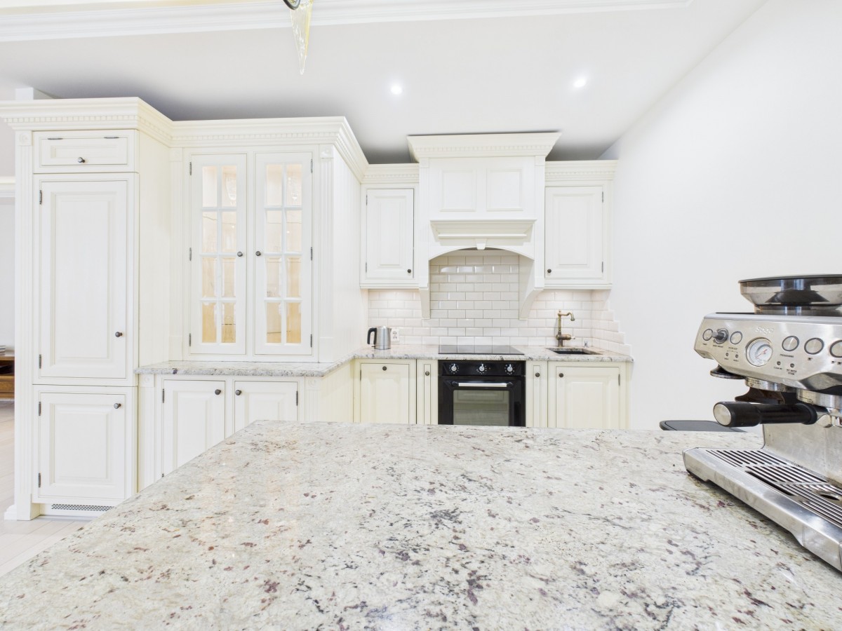 -kuchnia z kamiennymi blatami, pełnym wyposażeniem i klasycznymi meblami,