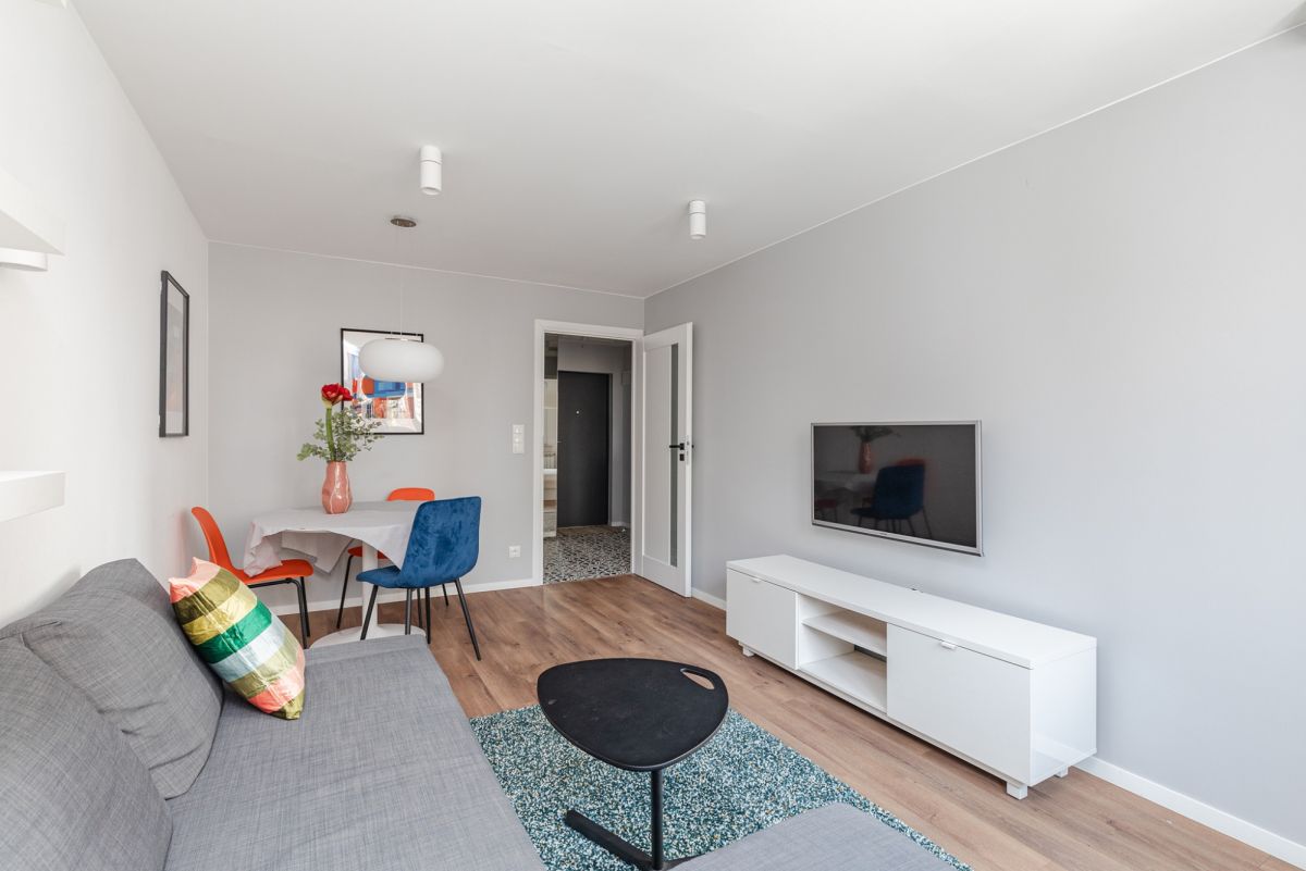 Mieszkanie dwupokojowe, z półotwartą kuchnią zostało zaprojektowane w taki sposób, by wygodnie mieszkało się tam jednej osobie lub parze - takich najemców też poszukujemy.
