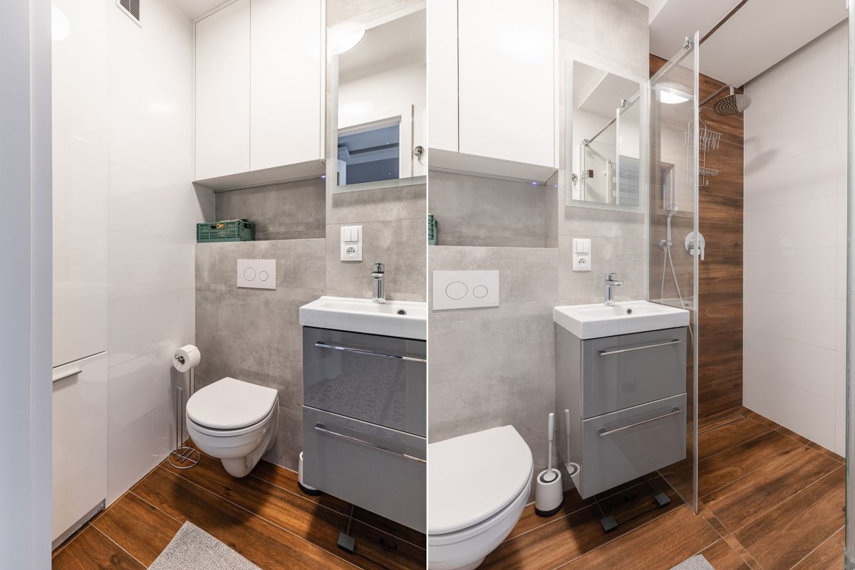Mieszkanie jest w pełni wyposażone we wszystkie meble, sprzęty AGD (pralka, zmywarka, kuchenka z piekarnikiem, okap, duża chłodziarko-zamrażarka), w łazience kabina prysznicowa, w przedpokoju oraz pokojach pojemne szafy.