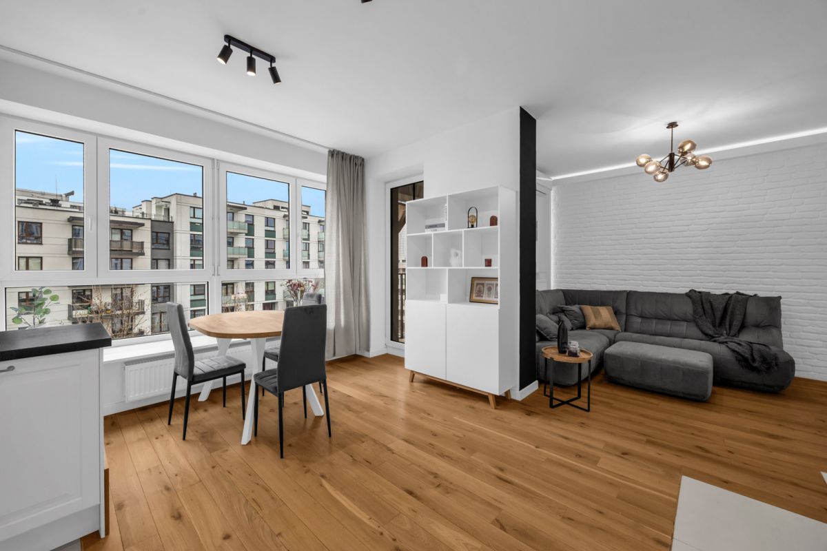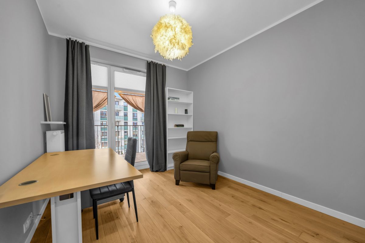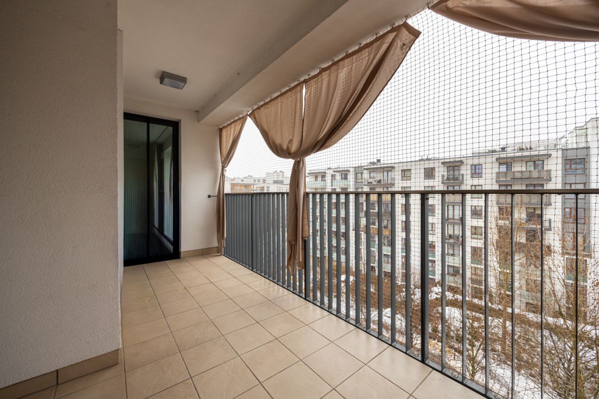 Duże okna gwarantują doskonałe doświetlenie oraz częściowy widok na Jeziorko Gocławskie i panoramę miasta. Duże parapety w salonie zapewniają również możliwość relaksu z wieczorną lekturą. Z mieszkania prowadzą trzy wyjścia na loggie o łącznej powierzchni 10,2 m², która doskonale się sprawdzi wiosną i latem. Dodatkowo zamontowano na nim specjalne zasłony, które dają poczucie intymności.