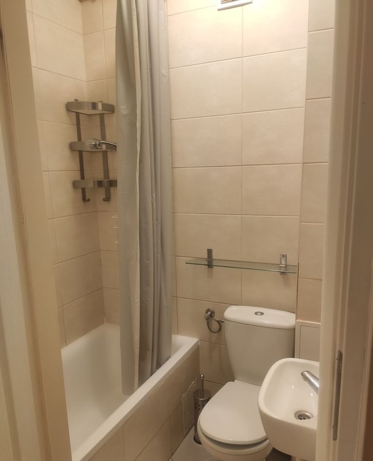W pokoju na podłodze panele, w kuchni, łazience i przedpokoju terakota.