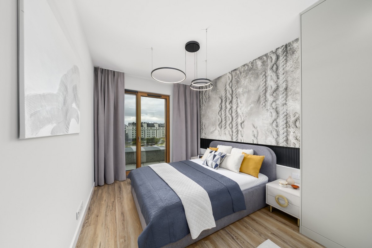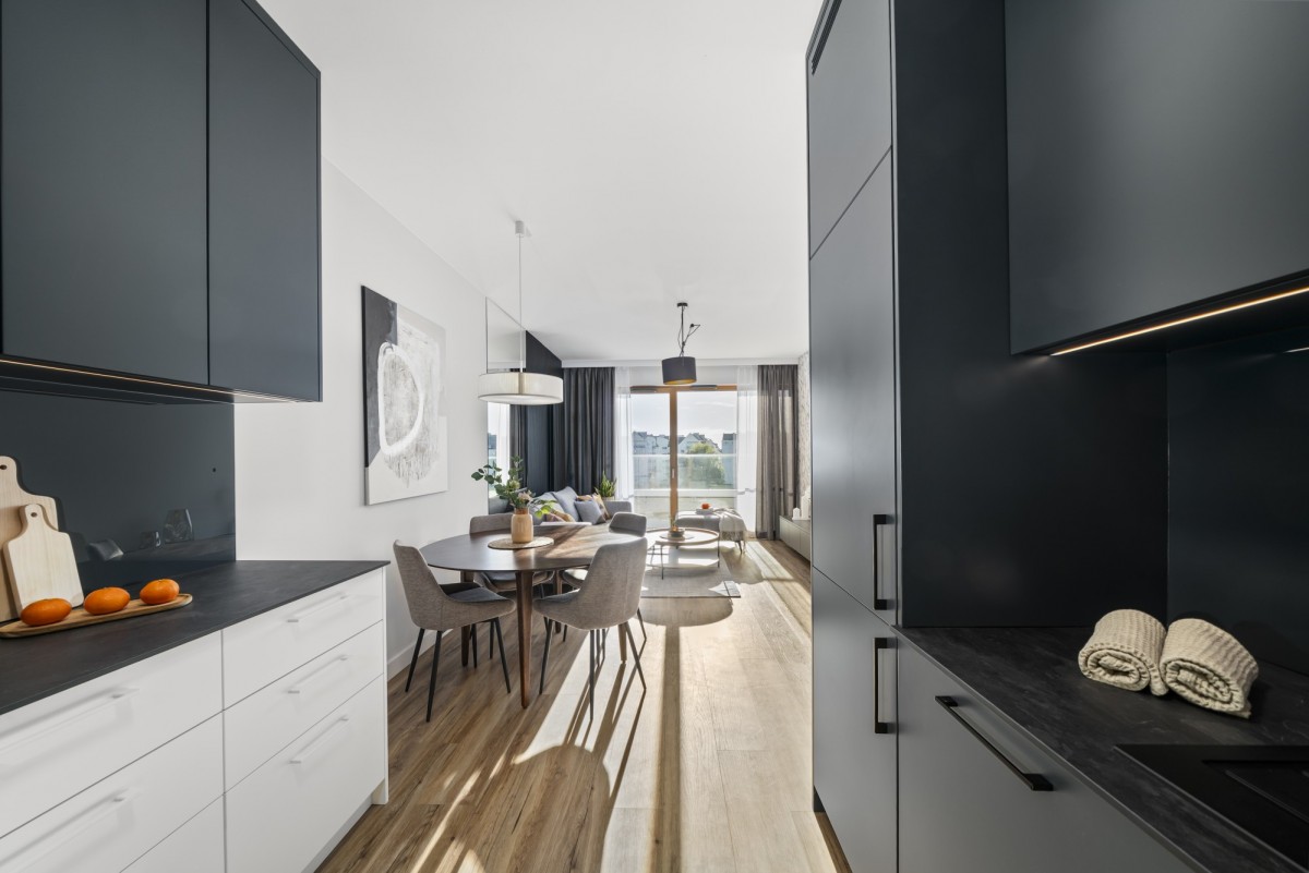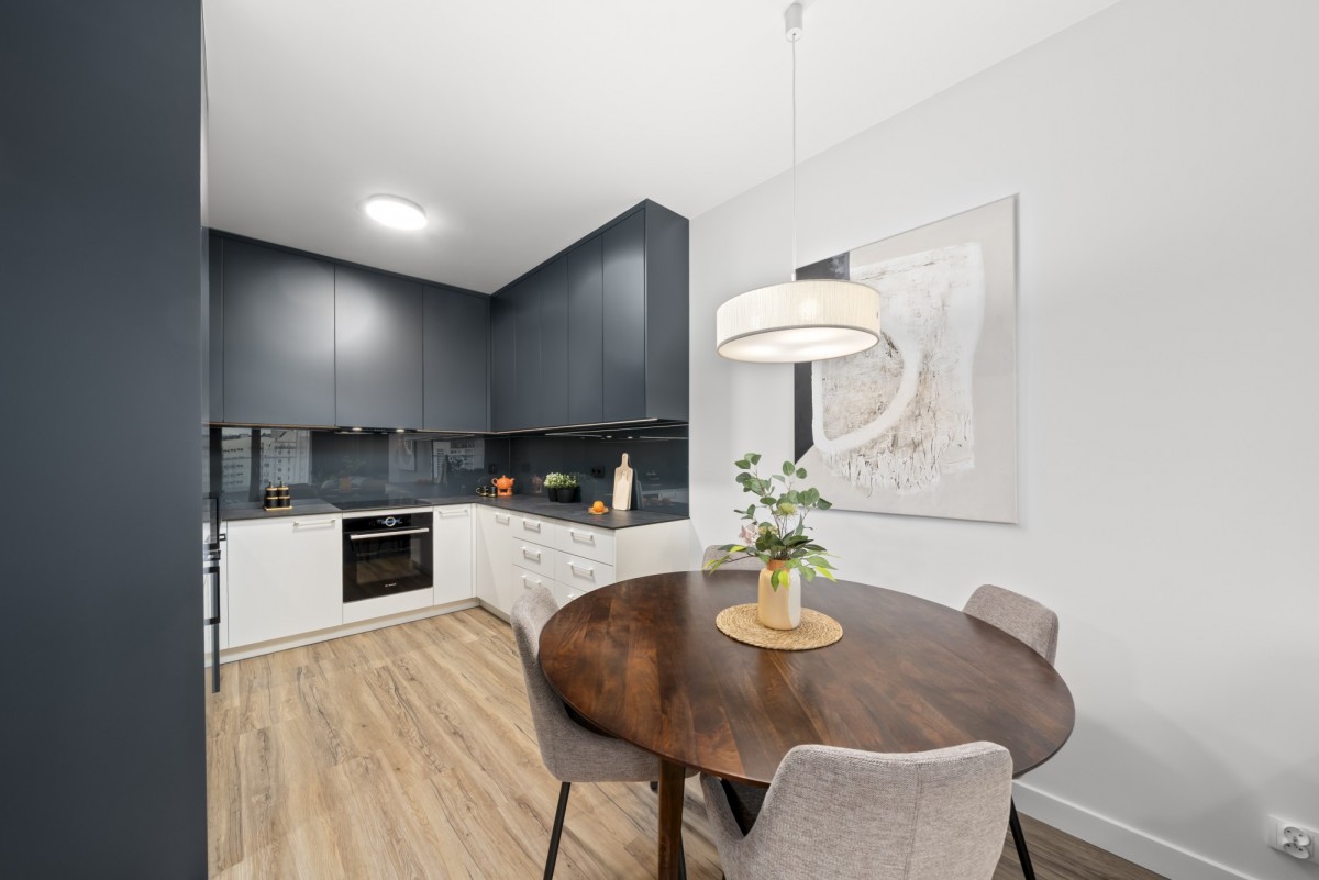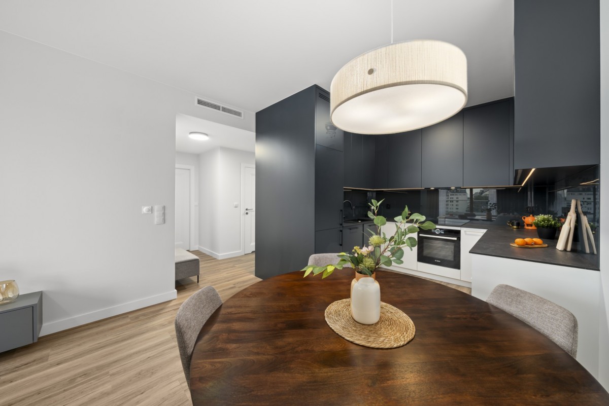 Salon z otwartą kuchnią i jadalnią umeblowany, główna sypialnia umeblowana, druga sypialnia (alternatywnie gabinet, pokój dziecka/nastolatka lub pokój gościnny) umeblowana, w tym zabudowa stała szaf ściennych na wymiar, telewizor na zapytanie najemcy.