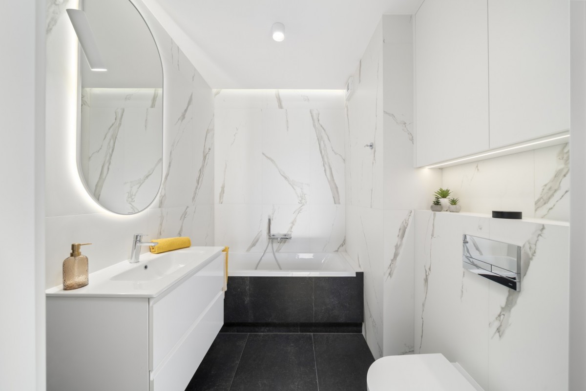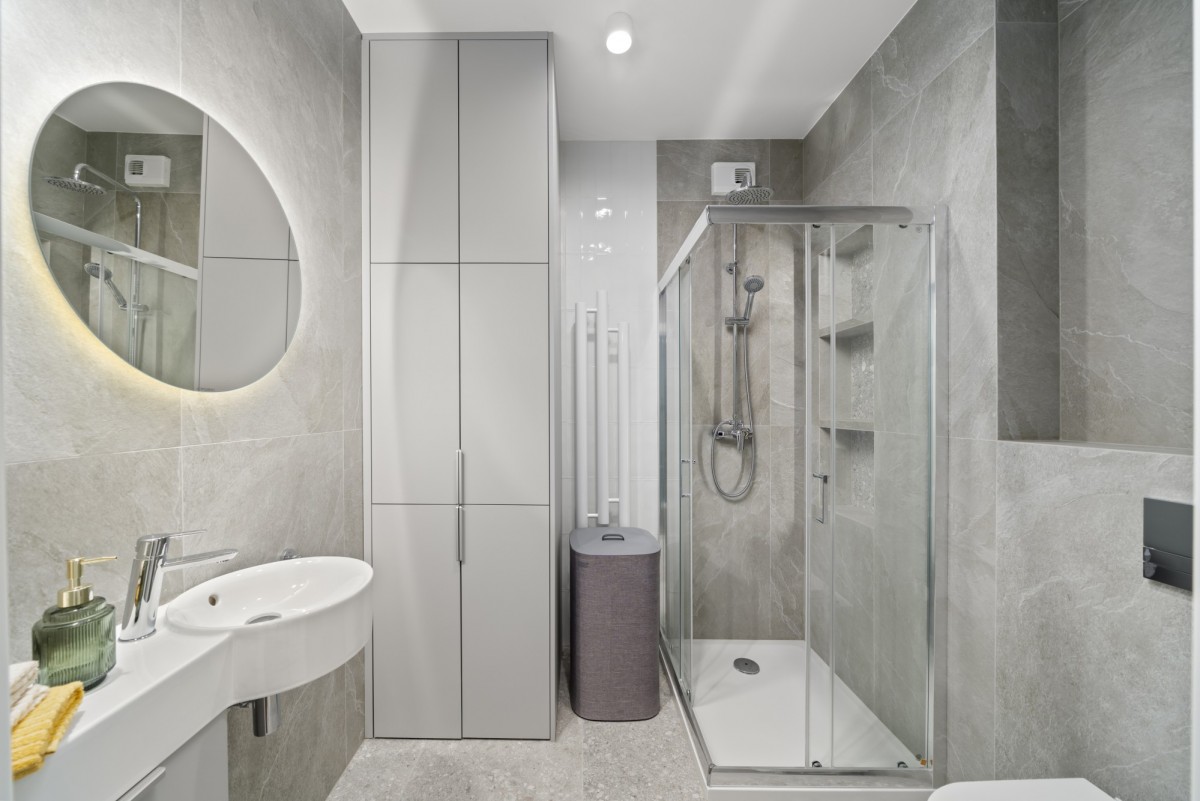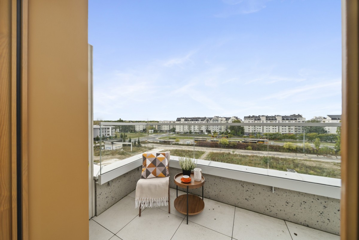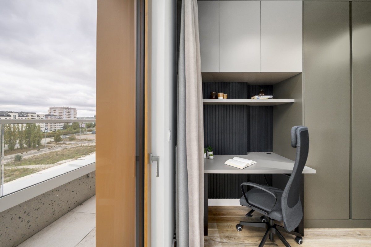 Salon z otwartą kuchnią i jadalnią umeblowany, główna sypialnia umeblowana, druga sypialnia (alternatywnie gabinet, pokój dziecka/nastolatka lub pokój gościnny) umeblowana, w tym zabudowa stała szaf ściennych na wymiar, telewizor na zapytanie najemcy.