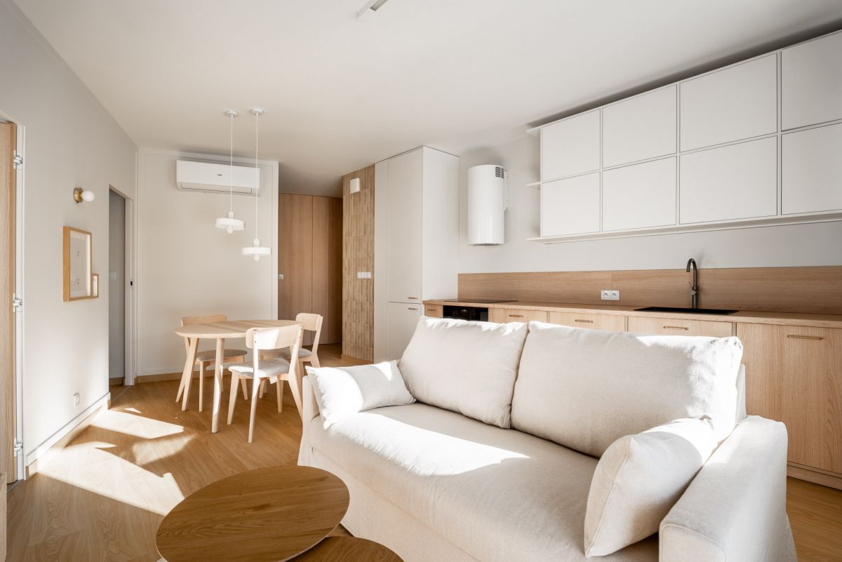 Wnętrze wykończone w wysokim standardzie — przemyślana aranżacja, stonowana kolorystyka i funkcjonalne rozwiązania zapewniają komfort codziennego użytkowania. Mieszkanie wyposażone w kuchenne sprzęty AGD, umeblowane i gotowe do wprowadzenia.