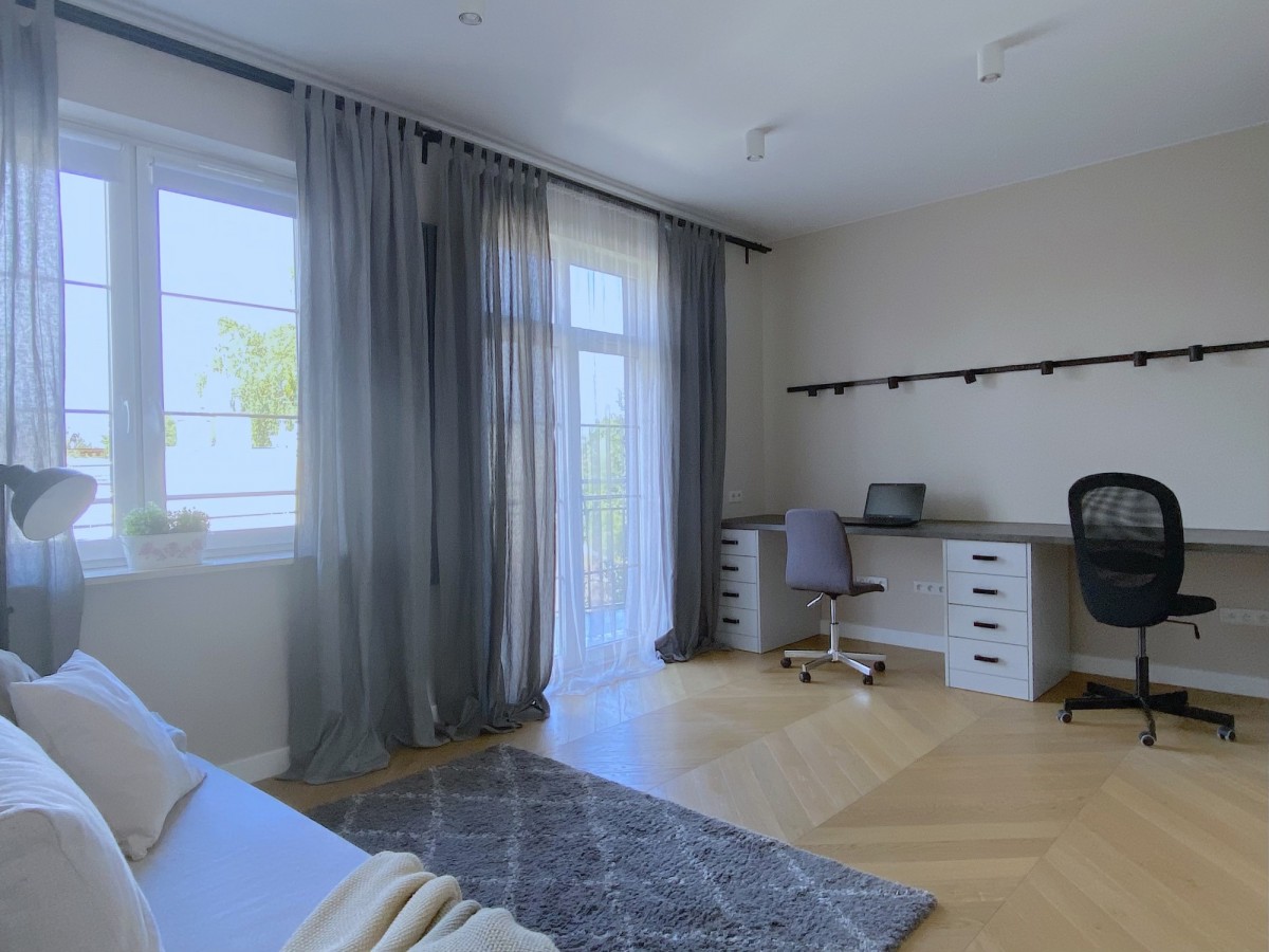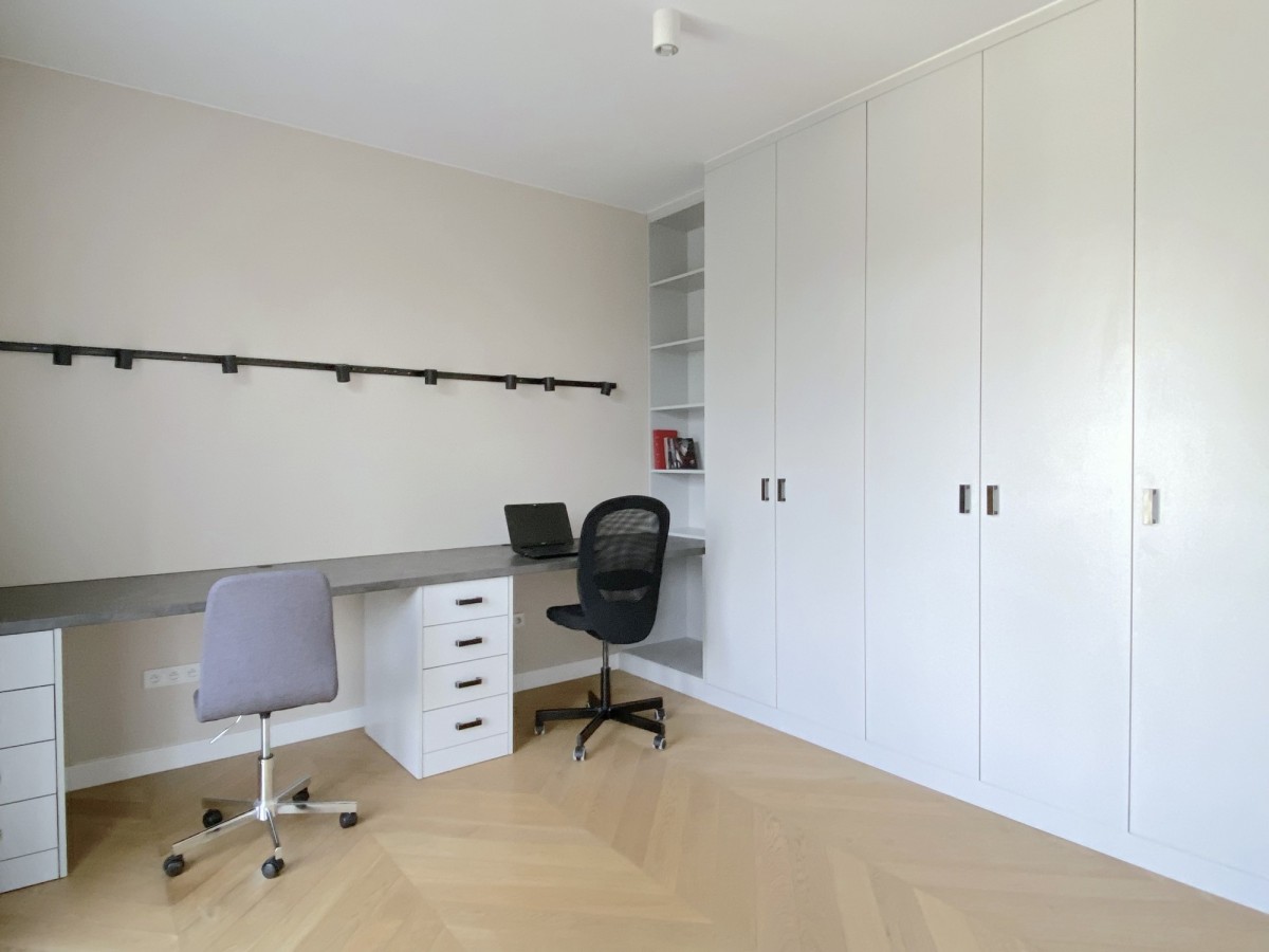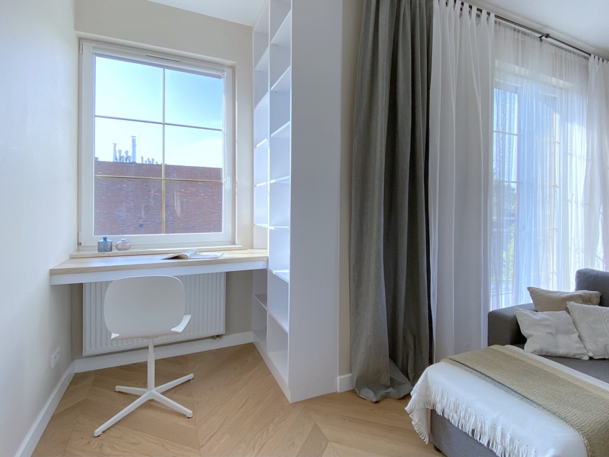W gabinecie rozkładana sofa, obszerne miejsce do pracy wygodne dla 2 osób, szafa w zabudowie i wyjście na drugi balkon.