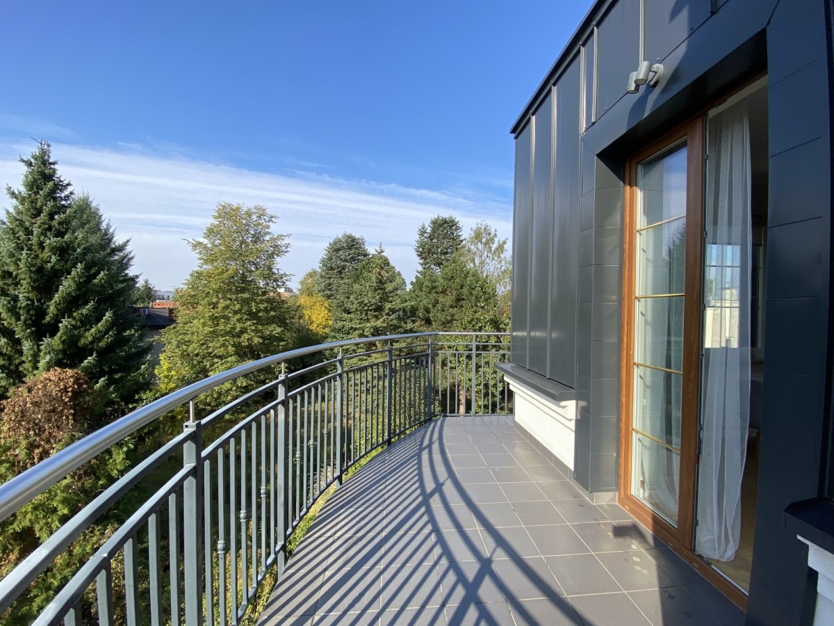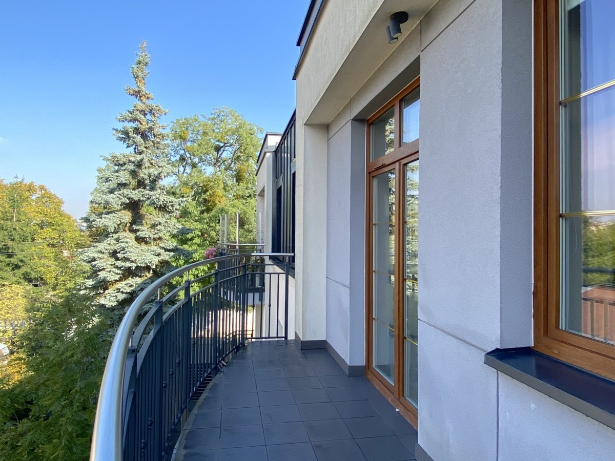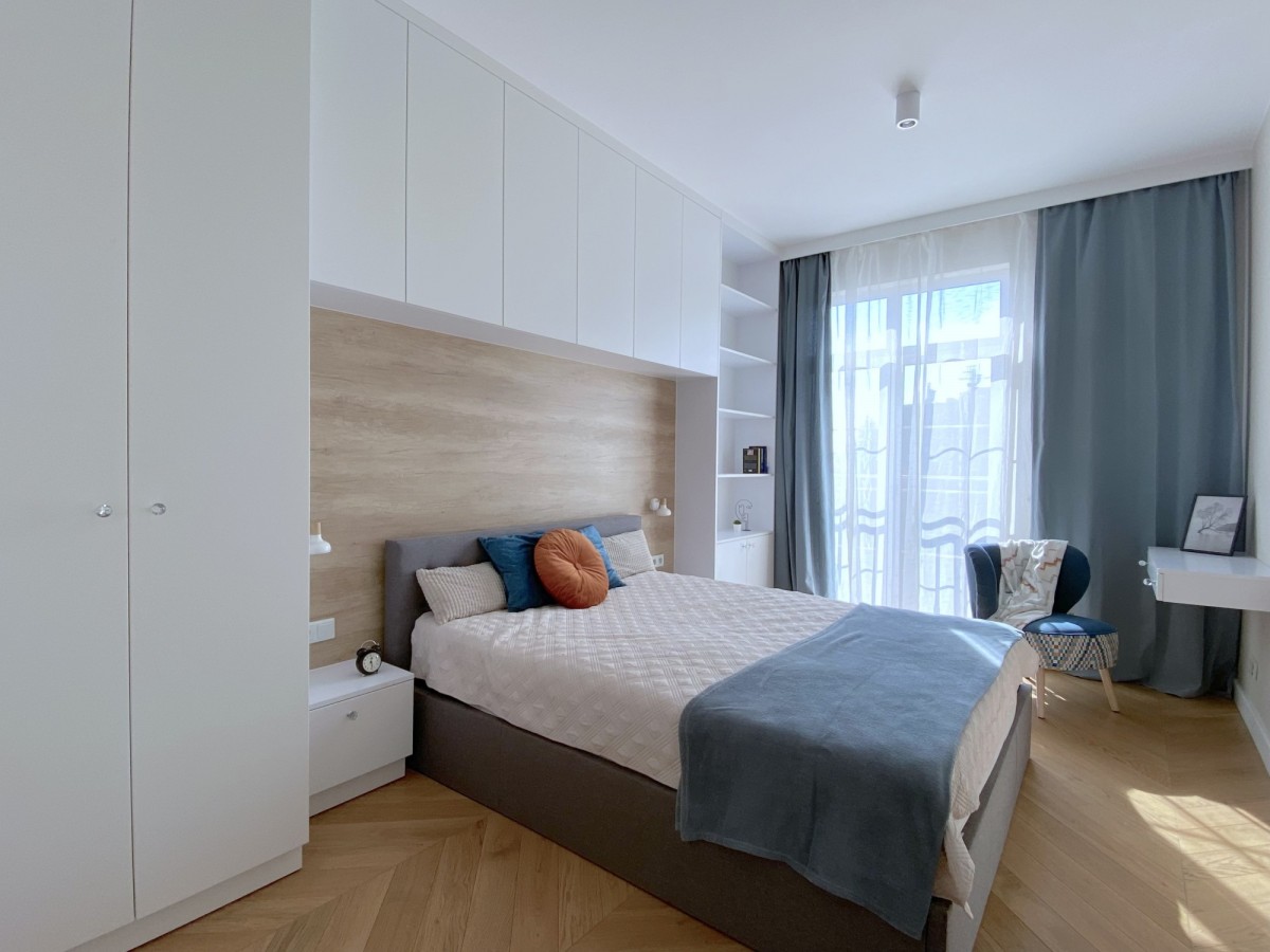 W gabinecie rozkładana sofa, obszerne miejsce do pracy wygodne dla 2 osób, szafa w zabudowie i wyjście na drugi balkon.