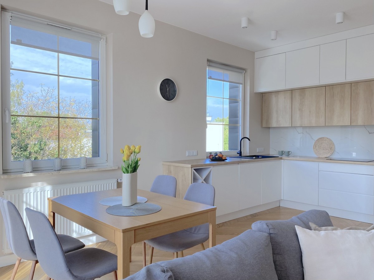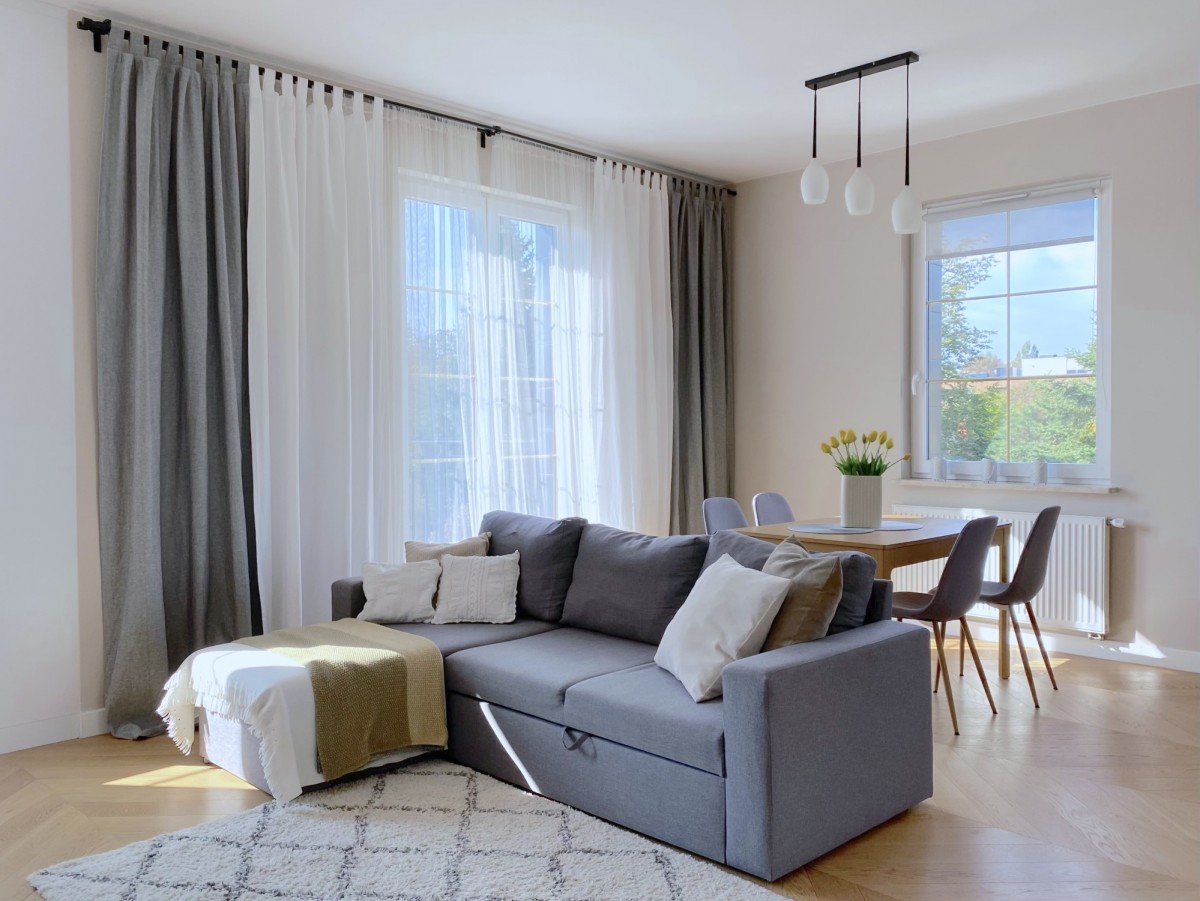 Przestronny salon z sofą, TV, wygodną jadalnią i wyjściem na duży taras od południa z widokiem na zieleń.