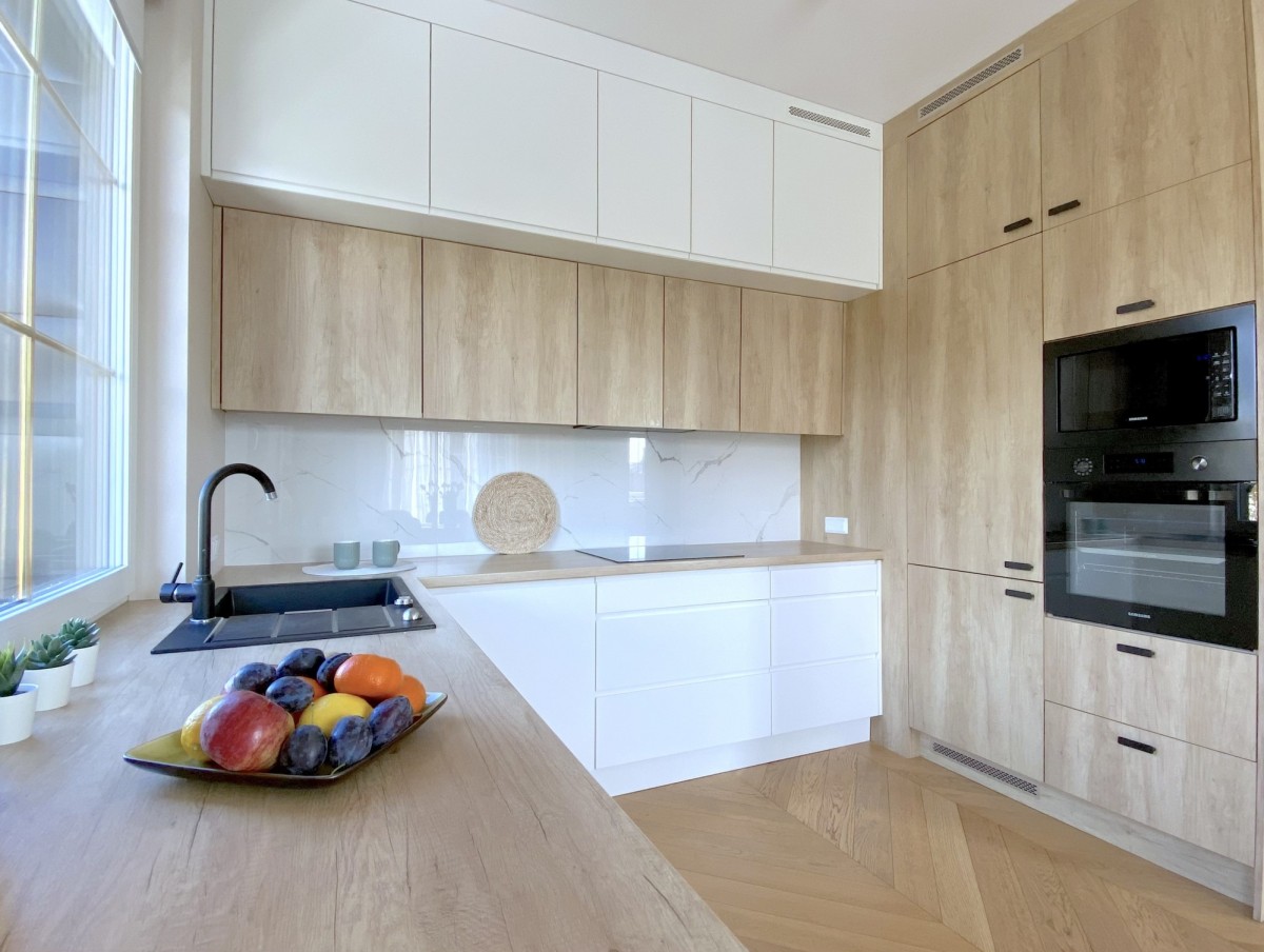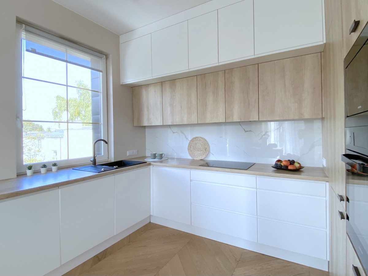 Kuchnia w aneksie z oknem, duża liczbą szafek i pełnym wyposażeniem AGD (piekarnik, płyta elektryczna, zmywarka, kuchenka mikrofalowa, lodówka, zamrażarka).