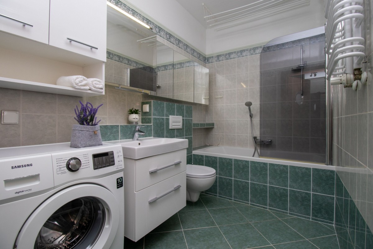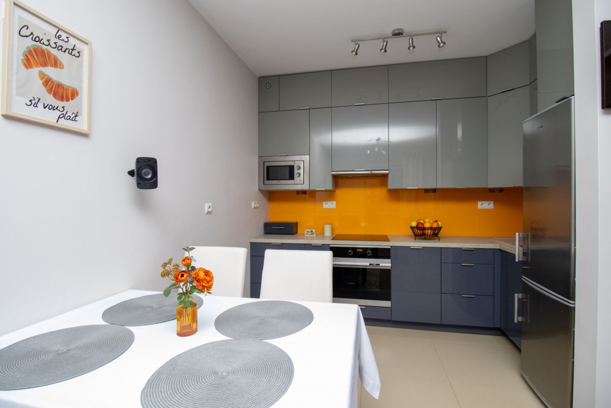 - W pełni wyposażona kuchnia (zmywarka, piekarnik, płyta indukcyjna, lodówka, mikrofalówka),