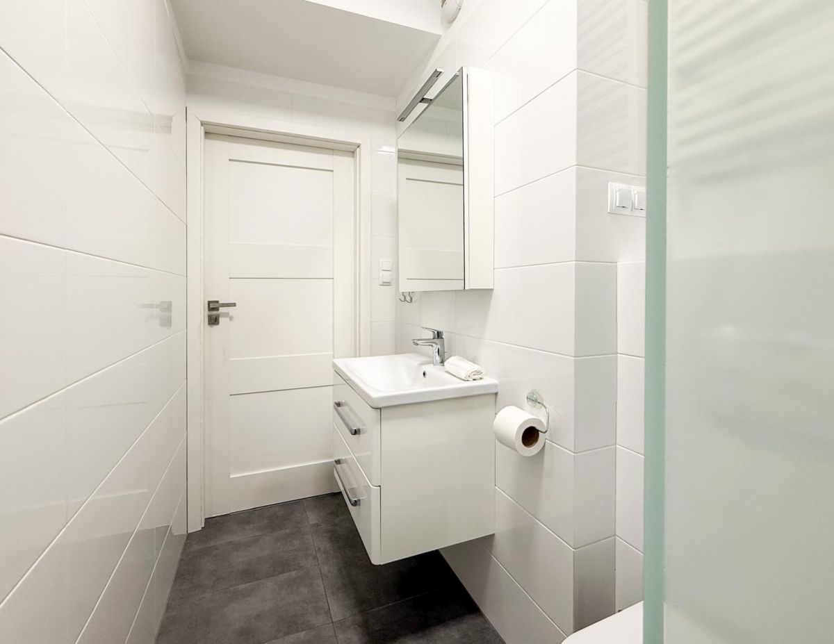 Nowoczesna łazienka z kabiną prysznicową, umywalką, toaletą. Całość jest elegancko wykończona, z wykorzystaniem wysokiej jakości materiałów.